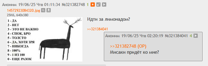 Я регулярно захожу в раздел /cute/ на ДваЧе, и каждый раз спрашиваю в одном из тредов, придёт ли ко мне Мисаки. Каждый раз мне отвечают, нет. Я спрашивал уже раз 150 и 150 раз мне ответили нет. Смысл в том, что отвечает мне один и тот же анон, отвечает с неизменной интонацией. А я каждый раз с неизменной интонацией спрашиваю: — А Мисаки придёт? — Мисаки не придёт. — Мисаки придёт или нет? — Мисаки не существует. — Позвольте узнать, Мисаки придет ко мне? — Нет, Мисаки к Вам не придёт. — Я бы хотел чтобы ко мне пришла Мисаки, это реально вообще? — Извините, но Мисаки не существует. — Мисаки придёт? Мне нужна Мисаки. — Мы ничего об этом не знаем. И ведь этот анон, зараза, знает меня идеально по стилю написания, знает, что я спрошу и знает, что он мне ответит. Но ещё ни разу ни один из нас ни картинкой, ни текстом не показал, что каждый из нас знает сценарий. Бывает, анон постит в соседнем треде, когда я захожу в этот, тогда я подсматриваю за ним, скролля соседние треды, он равнодушно дописывает ответы, покидает те треды и возвращается в этот: — Что вы хотели? — Мисаки придёт?. — Мисаки не существует. — Жаль. Иногда он общается с другими анонами в /b/, тогда, сидя в тех тредах, я терпеливо жду, когда они закончат и тред начнёт тонуть: — А Мисаки придёт ко мне?? — Нет, никакой Мисаки не существует. Иногда он просто скучает в тредах, когда в /b/ никого нет, и только я расхаживаю по этой доске. Конечно, он знает, что будет дальше, но не подаёт виду и равнодушно скроллит доску. — Что–то я Мисаки дождаться не могу, она вообще ко мне придёт? — Нет, не придёт, потому что её не существует. Это очень суровое, по–настоящему мужское противостояние, исход которого неясен. Очевидно, что каждая сторона рассчитывает на победу. Впрочем, я уже согласен на ничью.
