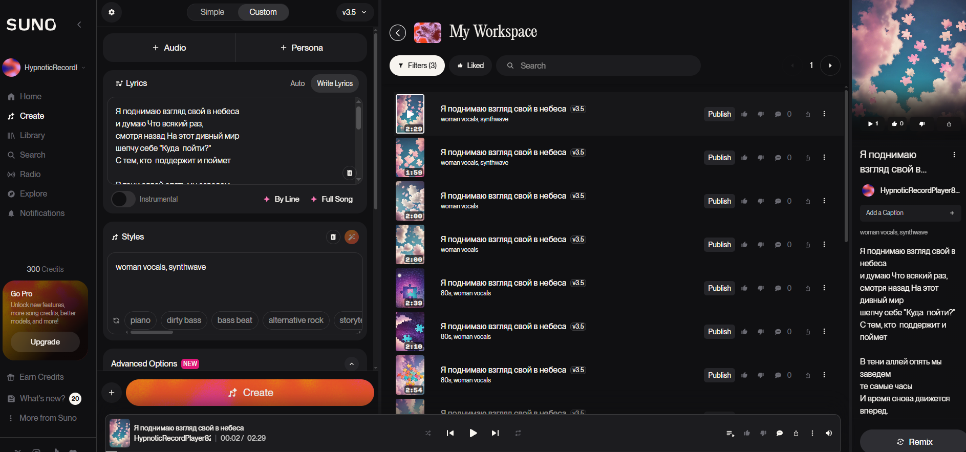 >>29958 suno.com, включи переводчик там все в целом то понятно, главное следи за количеством кредитов, чтоб потом не ждать сто лет когда они накопятся тебе на новые попытки
