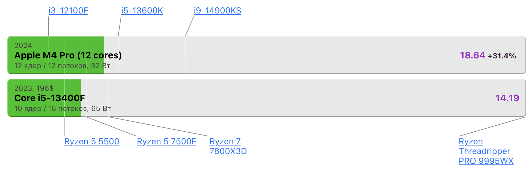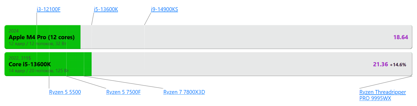 >>92286 Чел, ты... Ты ведь понимаешь, что сравниваешь актуальный m4 (ну почти) с прошлым поколением интел? Причем если я сравнивал с кастрированным айпятым, то ты сравниваешь с бюджетным на грани брака. И даже он держит марку. Практически бракованный серийный i5 прошлого поколения спорит с практически флагманом эппл. Вон у тебя там полосочка есть с актуальным поколением i9 интела. Глубину заглота ощущаешь? Не? Ой, да похуй.