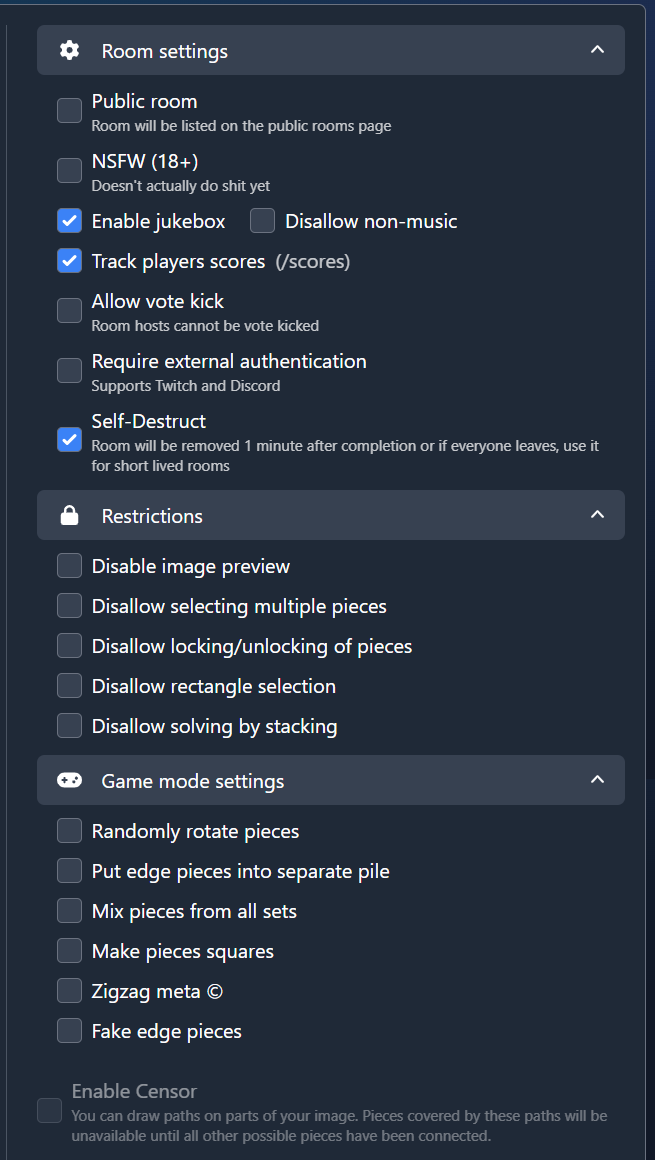 Настройки комнаты Отмечать всё как на оп-пике. Это базовая настройка 1. Randomly Rotate pieces - Снять галочку 2. Желательно снять галочку с Locking/Unlocking pieces(закрепление и снятие закрепления с рамки, собранных участков или отдельных деталек, чтобы эти участки и детали потом не путались и не терялись) 3. Галочки по усмотрению - Image Preview, Track Scores, Jukebox(музыка), Self Destruct, Rectangle Selection(выделение области с множеством деталек), Selecting multiple pieces(выделение нескольких деталек через Shift)