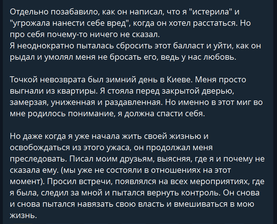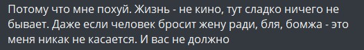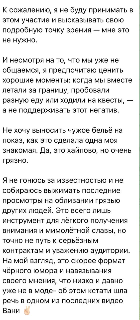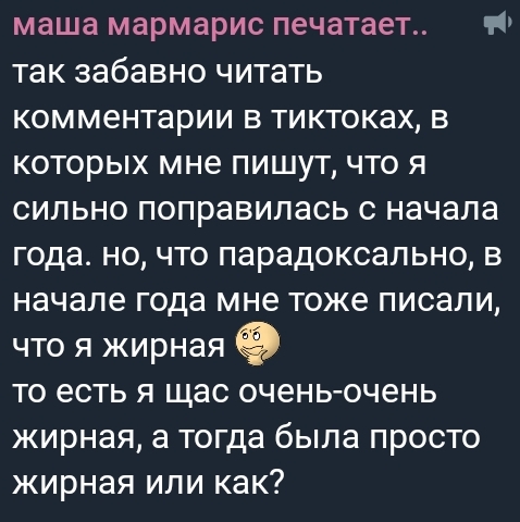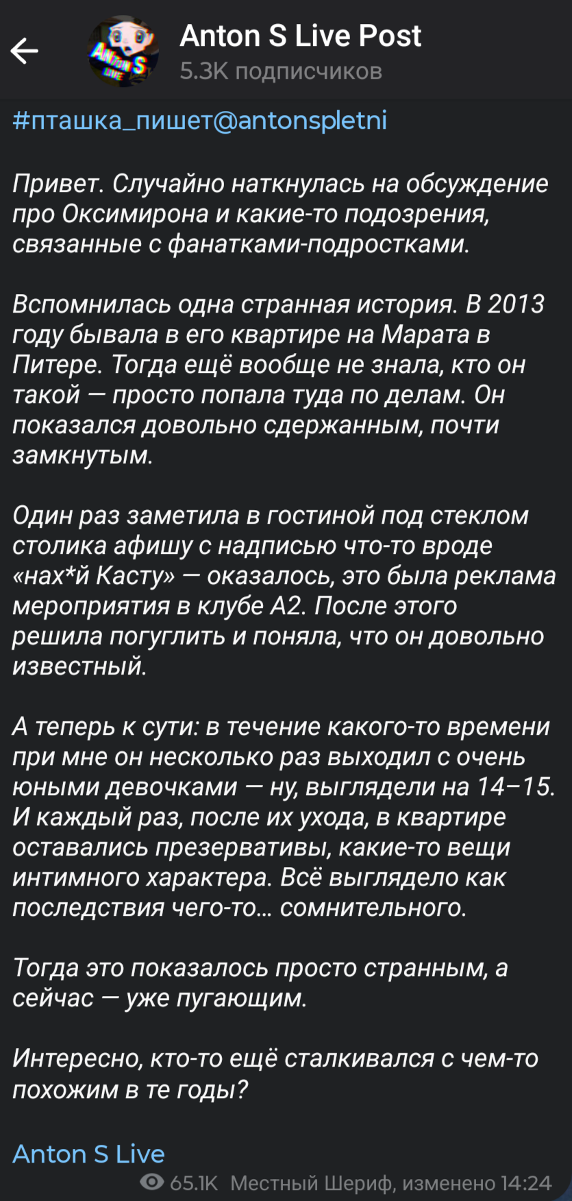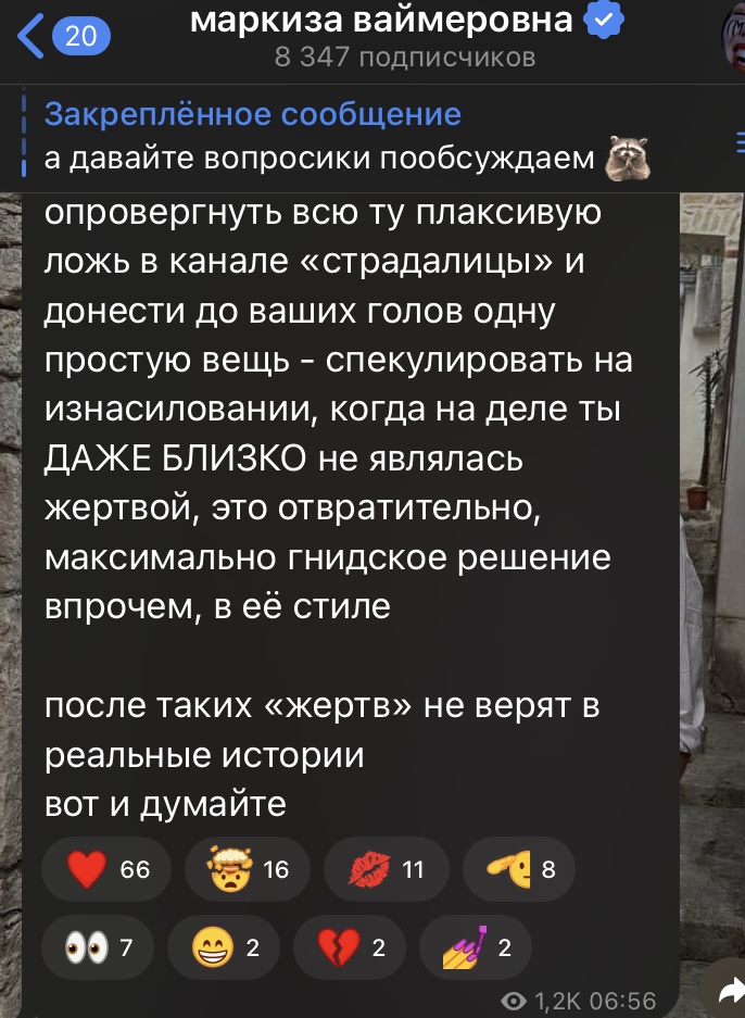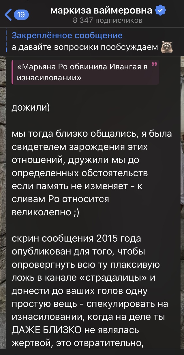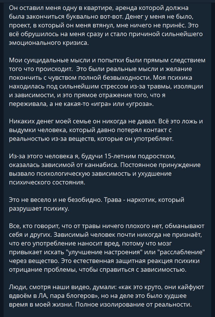 Я, наверно, не берусь осуждать сейчас никого, потому что давно приняла то, что мы все ещё будем ожидать от девушек репутацию "идеальной жертвы". Просто я когда читаю сейчас, что комментарии в тиктоке, что тред наш - девочки, мне не по себе. Сейчас одновременно происходит расследование касательно dav4d'а, который состоял в отношениях с ребёнком, и вот это обсуждение ситуации с Марьяной и Грибным ПДФом. Конечно, ситуации разные, но все же меня удивляет тот факт, что там даже нет и мысли ни у кого осуждать ребёнка в том, что он продолжал состоять в романтических отношениях со своим грумером. Тут же мне даже больно читать количество осуждения и грязи вылитой. Марьяна может многим не нравится, она могла в моменте романтизировать ситуацию, но вопрос вообще не в ней. Вопрос в поступке совершеннолетнего человека, который нес полный отчёт в своих действиях. Он был взрослым, а не она. "Куда смотрели её родители" - да, вопрос релевантный, но опять же, они несут ответственность как взрослые люди, которые законодательно были её опекунами, которые выбрали завести ребёнка и несут ответственность за его воспитание и безопасность, а не 14-летняя Марьяна. И тот факт, что ну все знали об этом преступлении, и обосновывайте его поведение незрелостью и чем хотите, но это преступление в стране, гражданином которой он является, но буря поднялась именно когда другой мужик взрослый об этом заговорил, мне тоже отвратителен. Тем более тот самый человек, который не поддержал свою же близкую, хоть и в прошлом, подругу, когда её травму без её согласия вылили в интернет. И ещё и поступил точно так же с Марьяной, начав обсасывать её травму на стриме, когда ему было выгодно это испортить как аргумент в споре. Ситуация со всех сторон мерзкая.