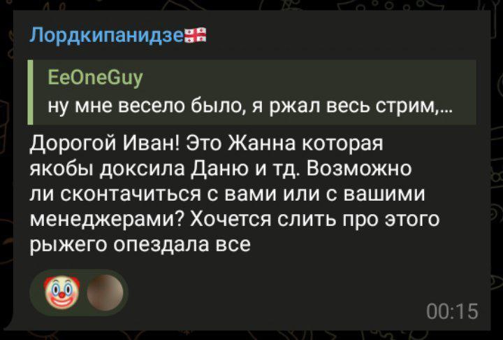 >>6277984 В это время Поеха: …если он сейчас ещё Жанну поддержит, человека, который мою семью травил… …угрожали моей семье блять! … вообще не сравнимо с тем, что я пожаловался, что мою семью травили… …если какой-то медийный человек выпустит видео, где будет смеяться с того, как мою семью травили… «…затронул темы которые меня лично пиздец выводят из себя… травли моей родителей… …ещё раз спрашиваю, Ивангай: какие действия ты предпринял лучше моих, когда травили твою семью?
