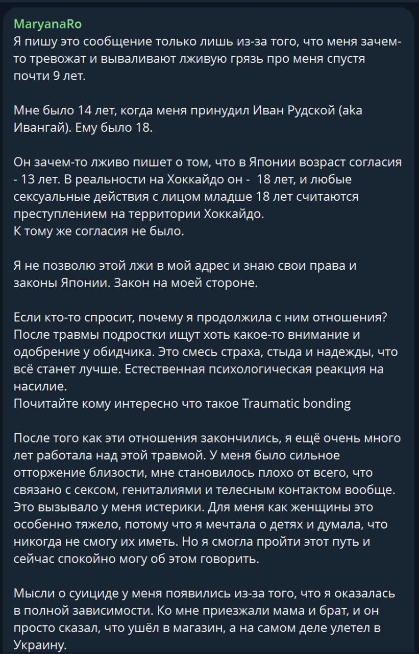 А у кого первый опыт был не травмирующий? 14, 18... это все равно страшно, волнительно и непонятно. Судя по твитам Марьяны и крисиным ее сообщениям - она была не пупуней далеко, которая домики в симсе строила. Он ее не юзанул и бросил потом, как поступают и 14 летние ровесники. Правильно тут написали - проблемы в ее родителях. Мать истеричка, батя, который пригласил сам Ивангая в Японию. Она просто ловит хайп. А ненависть к нему - следствие токсичных отношений с предками. Мне кажется Ивангай не залез на нее с мыслью "ооо 15 летние сисечки", он просто как тупой пацан мол хули нет, отношения же. Оба были малолетними дебилами, имхо