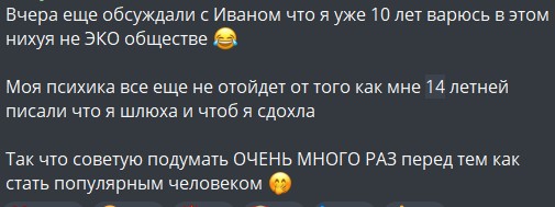 100 раз про это сказал. уже все поняли, что Поех оказался в не оч ситуации. но он ещё сам 100 лет вспоминать будет. и говорить о том, что когда других травили они нихуя не сделали. и только он один поднял тему сталкинга и начал что-то делать. он даже этого ивангая обвинил что он терпилой был в похожей ситуации. лооол.