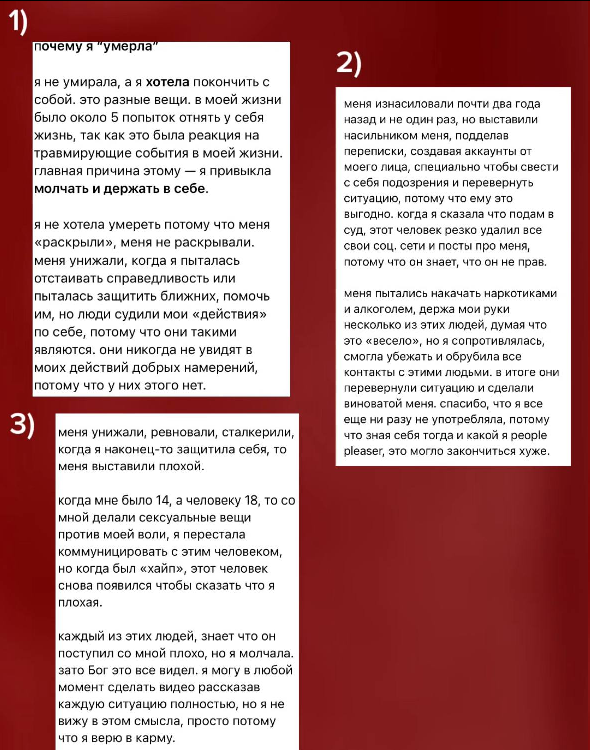 Она рассказывает о сексуальном насилии, попытках заставить её пить и принимать запрещенные вещества, о том, как её выставляли виноватой и отторгали даже после того, как она защищалась. В заключение она говорит, что не ищет чужого признания — ей важно быть понятой близкими и поделиться опытом, чтобы помочь другим; она верит в карму и в то, что правда когда-нибудь станет явной
