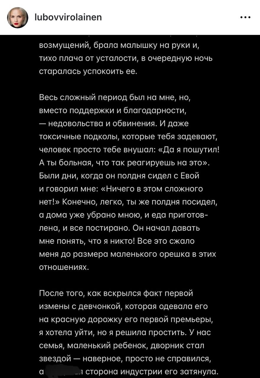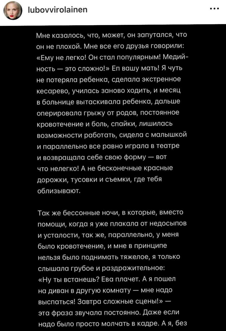 Как пишет Любовь, актёр «приносил домой с тусовок подарки от платформ, годовые подписки и новые венерические заболевания». Теперь внучка советской актрисы Любови Виролайнен будет сама воспитывать их дочь, а Константин не спешит общаться с ребенком.