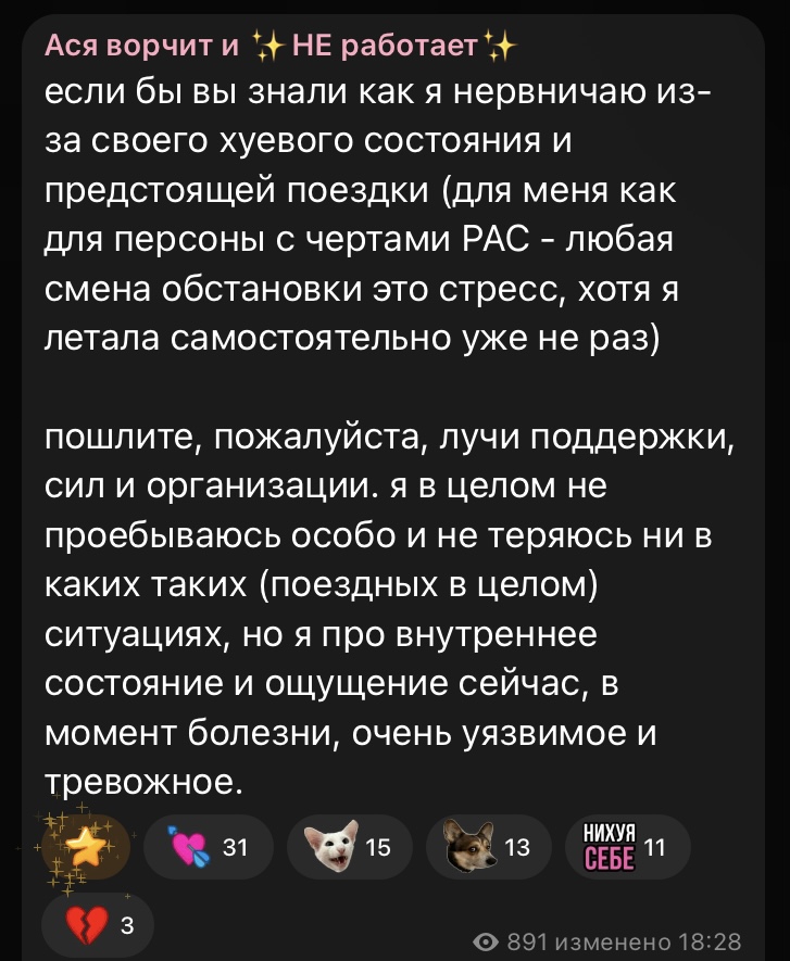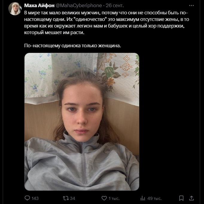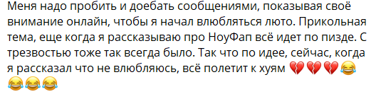 Даже если представить, что это реально пишет так называемый ивангай, и что это всё не прогрев для паствы бородача, заскучавшей и грозящей рассосаться и потерять интерес без своего сидящего в сизо гуру, по методичкам ивангая кстати какая-нибудь клопыня получается ещё большим сигмачадом, ведь она терпит с собой уже 10 лет холодного шизоида и коупит, считай постоянное одиночество и пренебрежение при живом парне/женихе. Если подразумевать значение слова одиночество, конечно же. А все эти базовички (особенно торчки просветлёныши), особенно при деньгах, на самом деле могут реально не страдать, ведь используют коупинг 100500 уровня - со мной бог, со мной будда, со мной гуру бородач, со мной гриб, со мной лес, со мной моё тотемное животное волк с футболки, со мной мои гениальные идеи, со мной моё великое подсознание, со мной духи моих предков, со мной моя великая цель и судьба, со мной братки из качалки и с грибных форумов, со мной коллективное бессознательное, со мной мать земля, я никогда не одинок, а вы все там нпс, быдло и так далее. Да и вообще, то что он выделил себе выходной среди стримов казика, криптоскама и коллабов с мдшниками погаллюцинировать в палатке, и то скорее всего под присмотром трип ситтера - это вообще не одиночество нихуя.