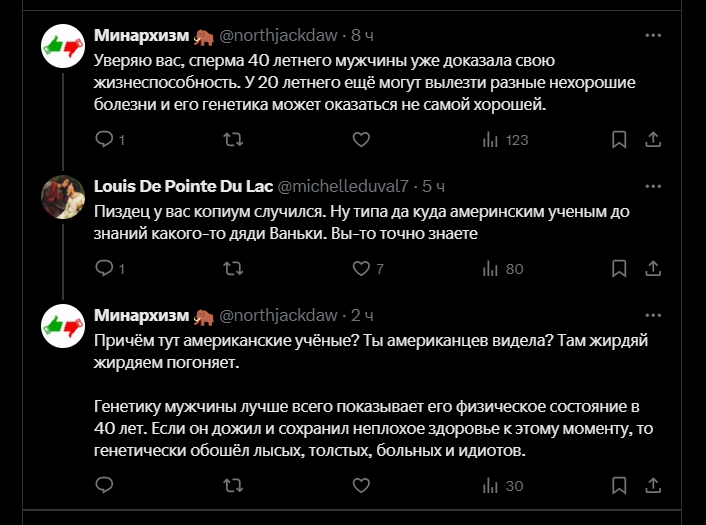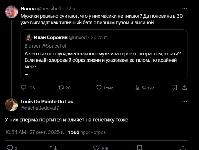 Не, у них именно что вставший хуй руководит буквально всем. Просто мужчины хороши в рационализации. Там где женщина честно скажет, что была дурой, мужчина подведет трехчасовую БАЗУ из биологии, истории, квантовой физики все бесценные знания получены из роликов на ютубе и википедии, конечно Ну и эта влюбленность сильно меняется от уровня тестостерона. В 20 лет шишка встает на все, ценность пизды высокая, поэтому там и кобыла невеста. В 30 либидо драматически снижается под воздействием возраста и нездорового образа жизни и там вообще становится сложно с этим делом.