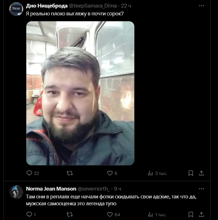 >>6294854 Рандом-болталки в дисе, разные рулетки, где еще часто подвыпившие глубинарии и проч. Не могу сказать, что какие-то откровения, просто особенности мышления. Ну, одна из особенностей, но для кого-то, возможно, неочевидная - ни один моральный урод, жестоко поступающий с тян, себе не признается в этом никогда. Например, когда у куна много одноразовых связей, он не будет думать, что он поступает как-то плохо, он думает про этих тян, что они шлюxи и для них это норма. Когда я спрашивала такого, почему он уверен в этом, он сказал, что "Это видно. Я же вижу, как они сосут и т.п." Один кун ходок по проституткам говорил, что считает себя их "спасителем", потому что он всегда "заказывает классику, а не извращения", потому что он считает себя симпатичным и у него были тян, а значит он лучше других ходоков и с ним проститутки как бы "отдыхают". Большинство не упиваются тем, какие они злые, они всерьез считают себя хорошими. Ну и рефлексия убитая у большинства таких, много самовранья, много слышала и стори про бывших стейсяр, перед которыми прогибались, тоже не осознавая это, у них уже другой мужик, а они все забыть их не могут. Разное, короче.