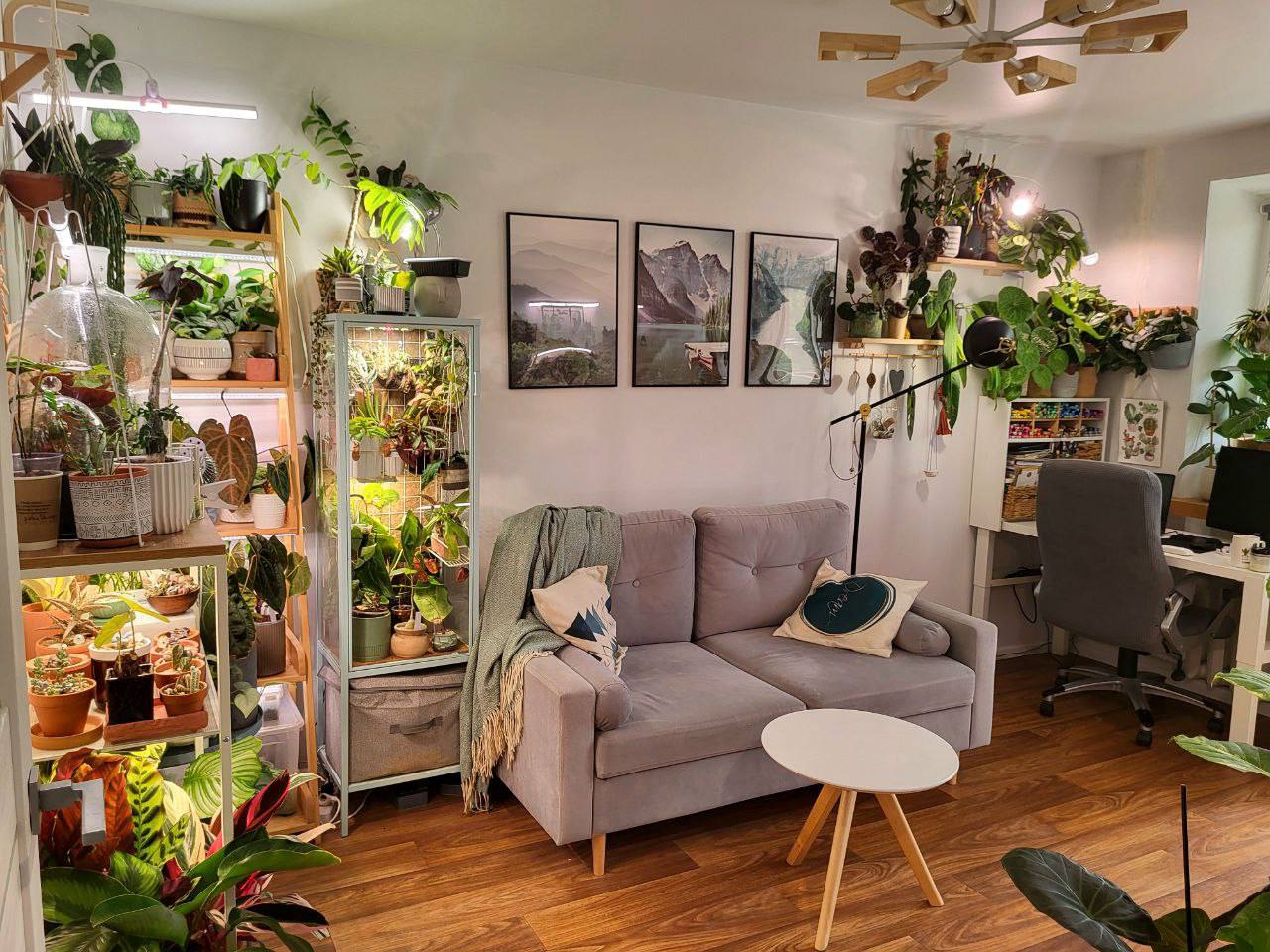 >>6251474 >с регулируемыми по высоте полками Сразу непрошеный совет - расстояние между полками должно быть повыше или регулироваться, да. У меня стеллаж типа пикрил, высокий, живет на лоджии утепленной круглый год, расстояние между полками побольше, чем на фотке. И ikea greenhouse cabinet, погуглите, кто не в теме, в инсте по тегам и на пинтересте-реддите полно - охуенная тема, и как украшение интерьера, и с практической точки зрения (пикрилы 2-3-4). У меня икейный бирюзовый шкаф металлический, а так подойдет любой - из салона стеллаж стеклянный (бывают на авито), медицинский шкаф металлический, та же икеа, в общем, на что фантазии хватит. Главное - не деревянный, сырость-с, влага-с. Внутри у меня живет в большом отвесе аква-лампа, она греющая, и диммер к ней - там выставлен автомат рассвет-закат, само всё включается, постепенно свет становитяс ярче, потом к концу дня тускнеет и выключается. Там живут тропические всякие товарищи, темпра 26-29, прыскаю им там когда не забываю, чтоб влажно было. В нижнем отсеке помельче лампы с али для растений, диодки тоже, не греющие, белые - там те, кому не надо жару, но нужен свет. Шкаф иногда проветриваю, но он и так не герметичен. На задней стене висит икейная доска с дырками, на ней крючки и полочки для подвесных горшочков. Периодически у меня там кто-нибудь вырастает, крепнет - и уезжает наружу, внутрь заезжает очередной мелкаш (люблю выращивать из мелкоты крупное). Смотрела туторы, как заморачиваются забугорные растениеводы - кто-то изолирует полностью шкаф от сквозняков, внутри увлажнитель, всякие датчики - я так не парюсь.