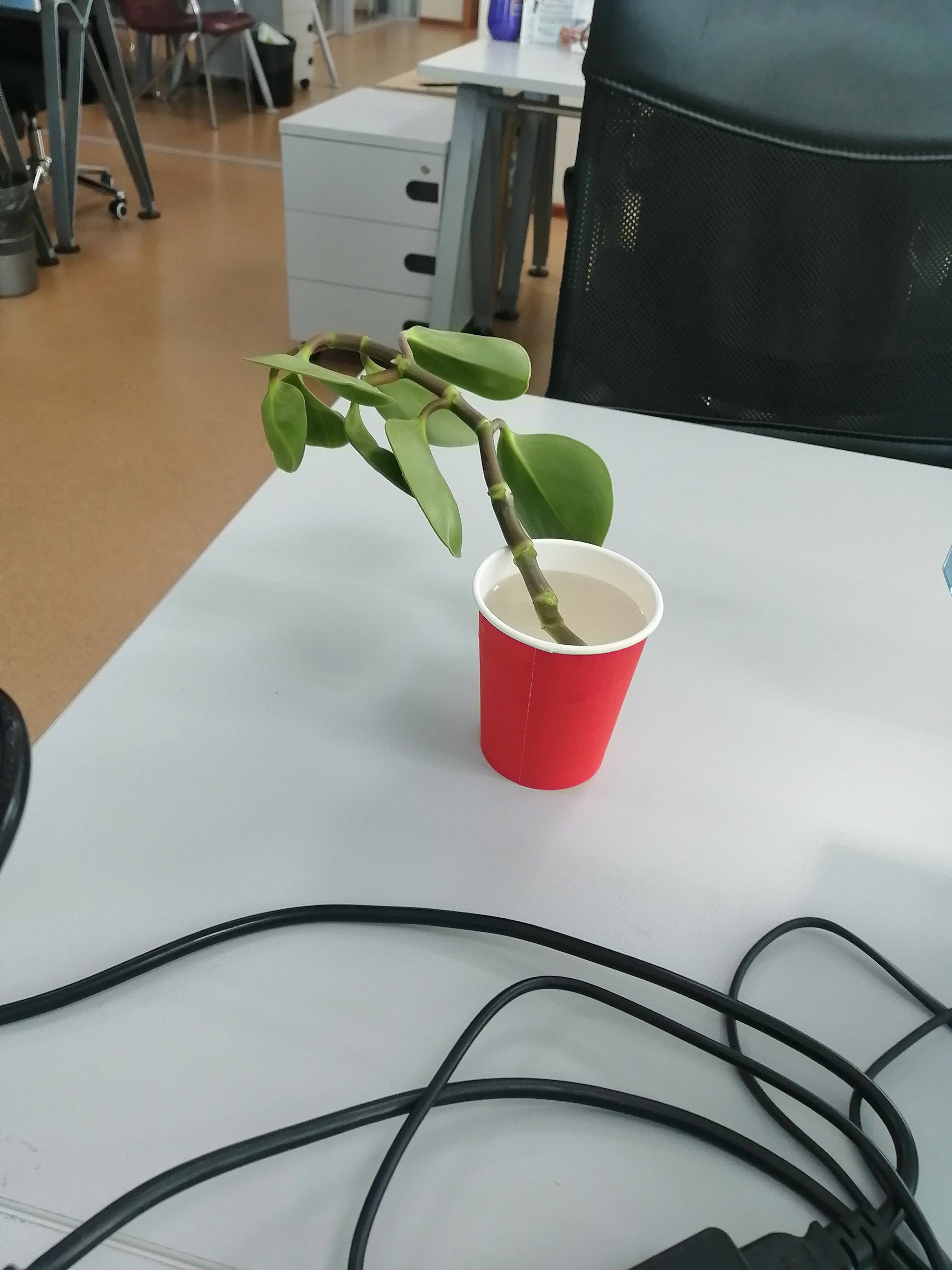 А вот еще офисная пеперомия так разрослась, что одна ветка просто отвалилась и лежала на подоконнике. Была мной обнаружена и оприходована. Меня предупредили, что пеперомия может по 2 месяца в воде стоять и не давать корней, ну это звучит как вызов! Дома я ее укоротила и нижние листья убрала