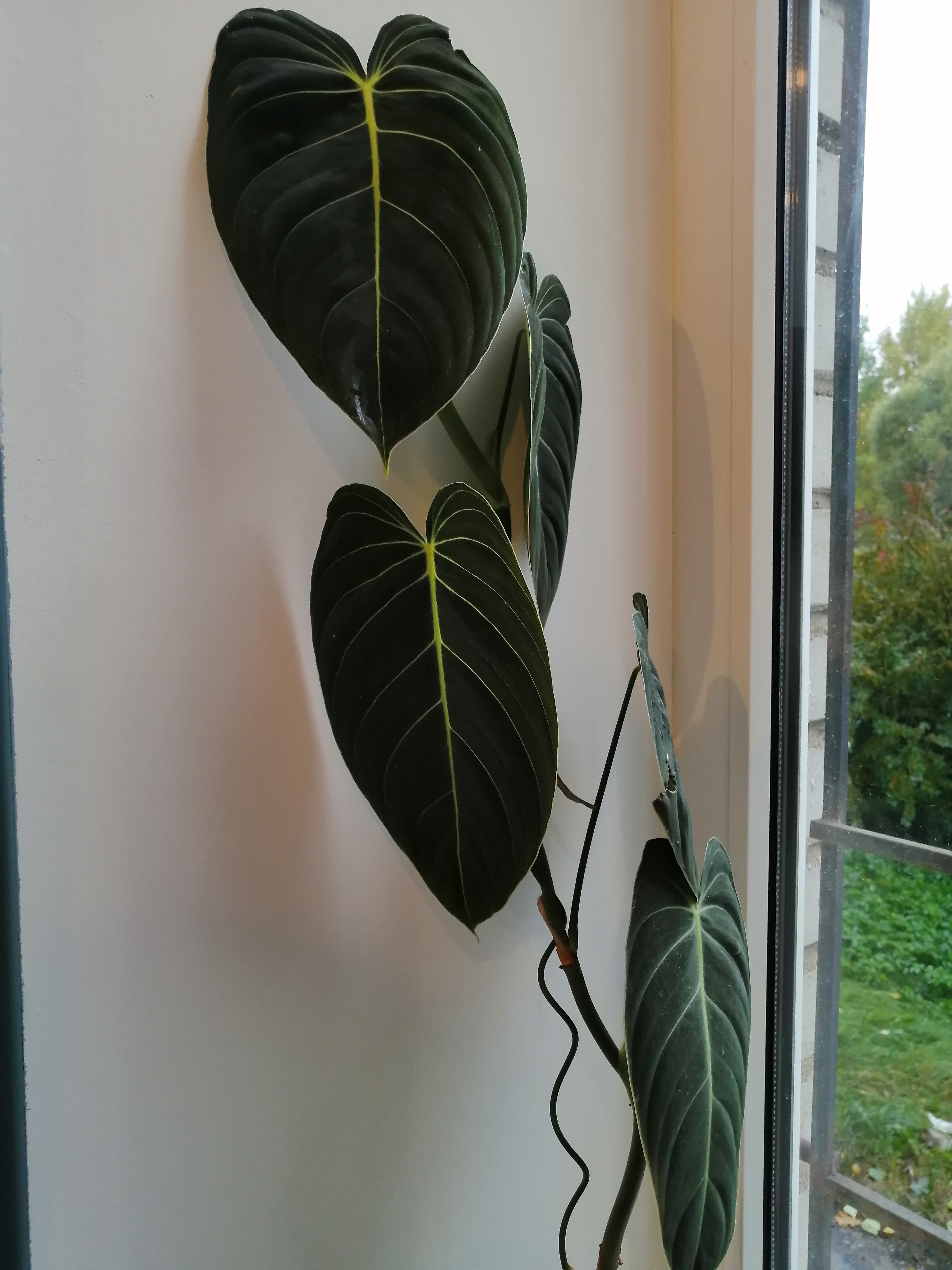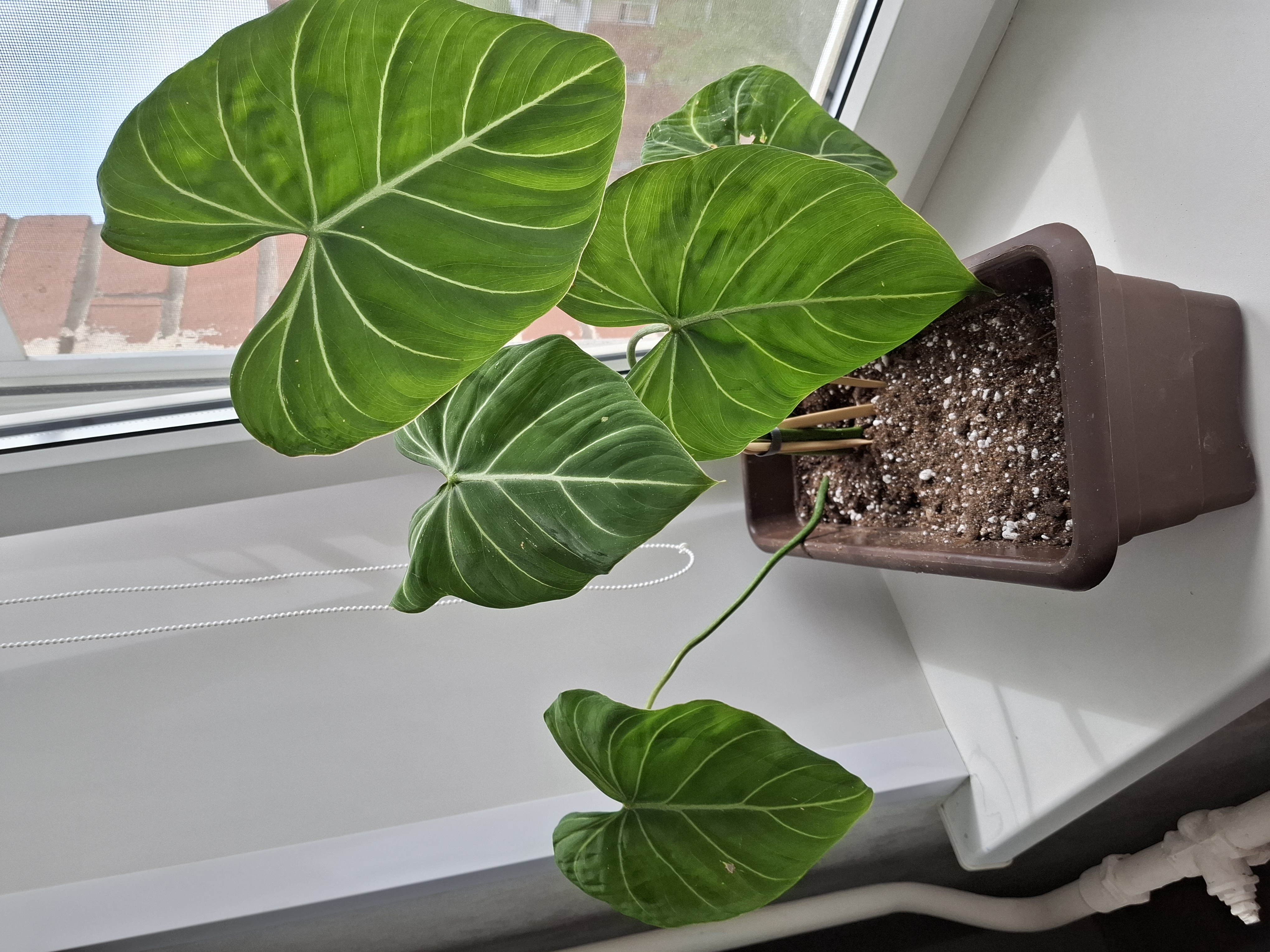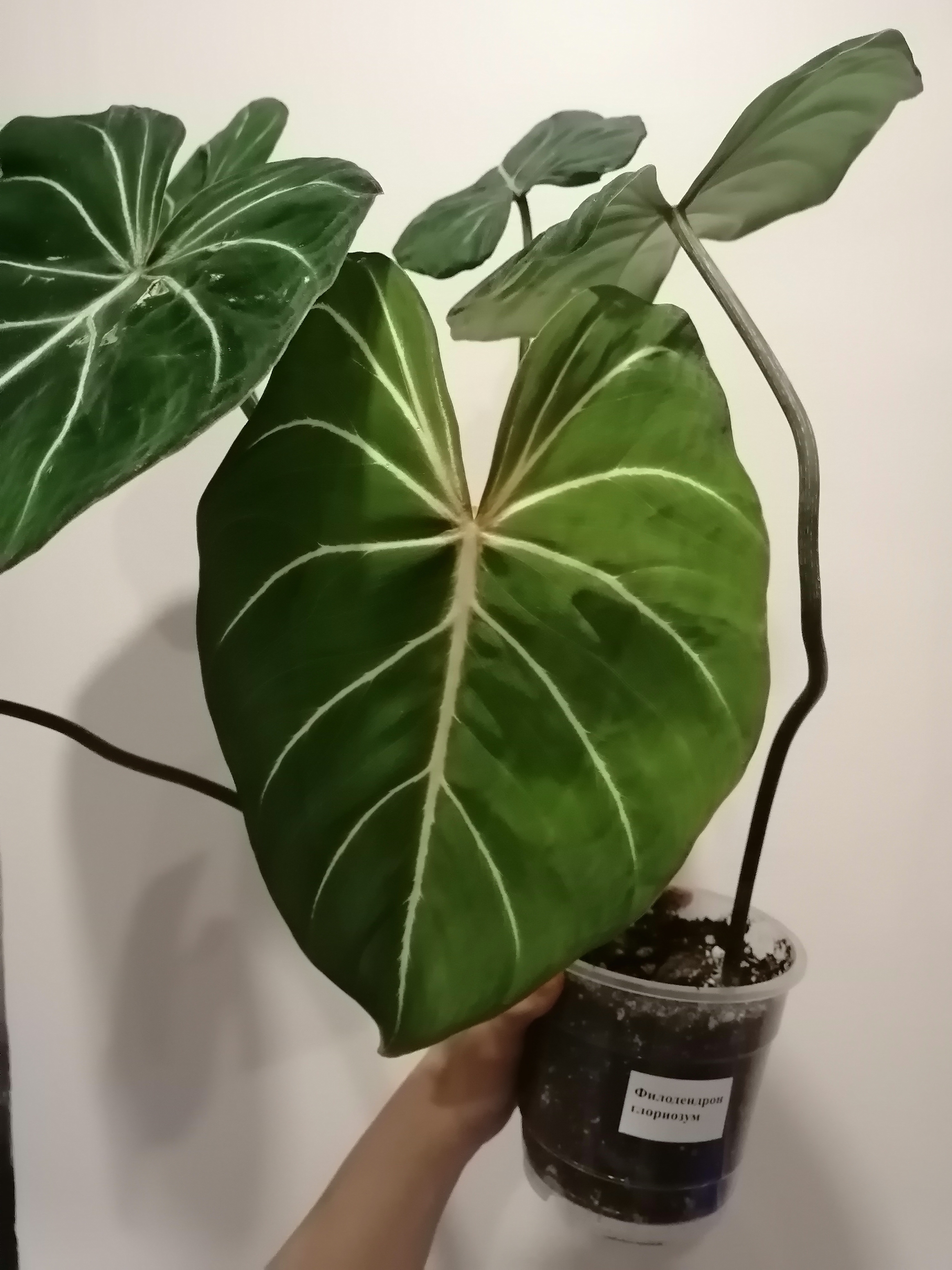 В подарок на др получила филодендрон глоризиум. Красавчик, люблю такие большие насыщенные зелёные листья. Пока тащила домой - помяла его, а потом еще и поставила на подоконник, эт я зря, конечно, вон имеющиеся листья пострадали. Но новый листочек слева внизу развернулся целый и красивый. Цветок-ползун, пытается сбежать из горшка, буду думать какую-то опору ему, видимо. Стоит в очень тёплой, но довольно слабо освещаемой комнате, на тумбочке под настольной лампой.