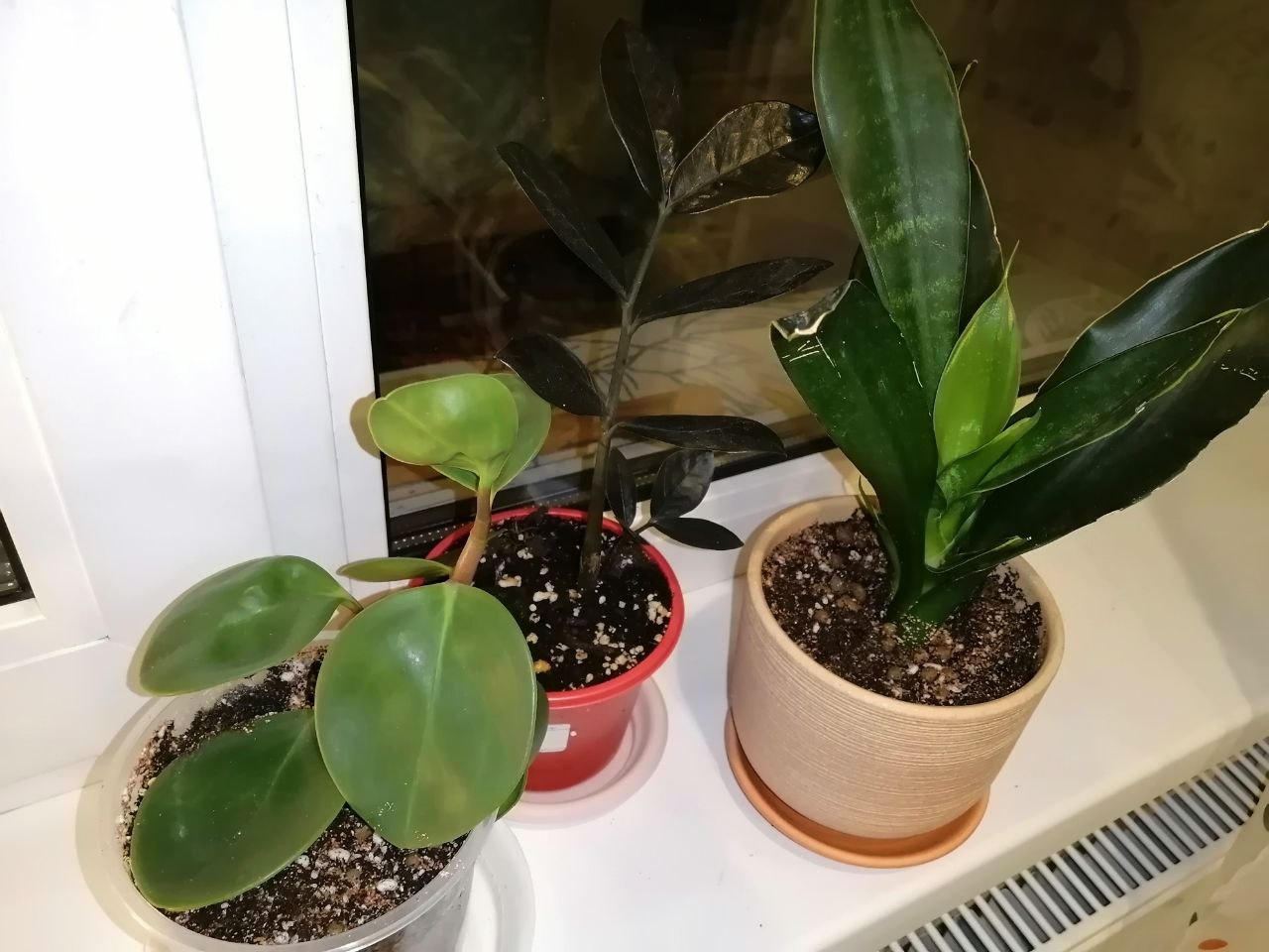 Я наконец добралась до пересадки! Купила длинный ящик для филодендрона и глиняный горшок для сансевиерии. Пока делала дырки в ящике - сломала нахер дно, пошла трещина. Ну я всё равно посадила, послужит сколько-нибудь, думаю. Для пересадки взяла универсальный грунт TerraNova, перлит, вермикулит, немножко песка (хз зачем) и мелкий керамзит. Намешала это всё вообще на глаз. Для сансевиерии керамзита кинула побольше, она ж суккулент. Пеперомия теперь в горшке филодендрона и с его наклеечкой, самозванка! Сансевиерия чот пипец хило держится, надеюсь корни распространятся и она не выпадет. Замиокулькас не трогала, он в этом горшке ещё минимум год будет наращивать корни и клубенёчки, и снаружи выглядеть ни рыба ни мясо, предполагаю.