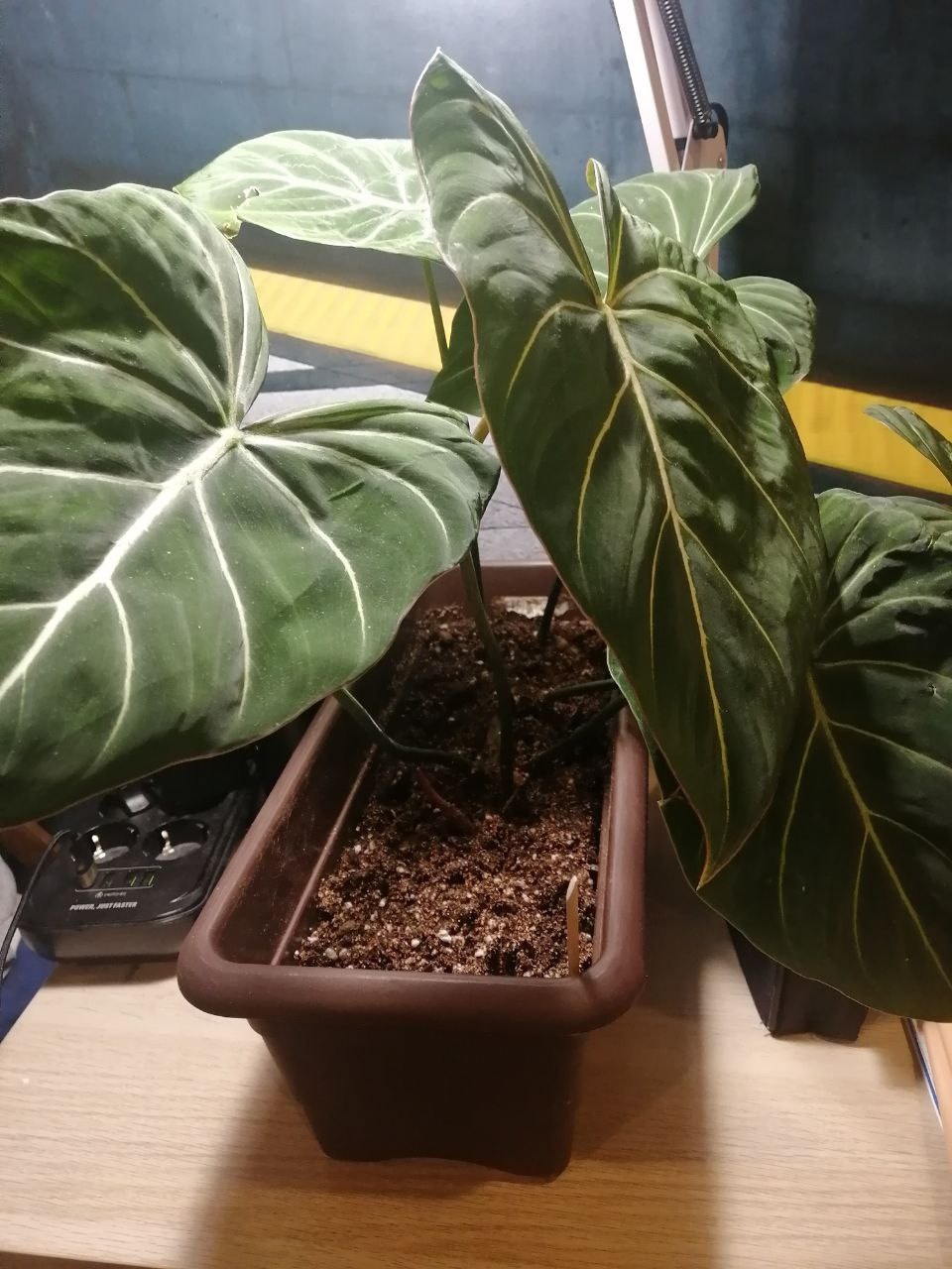 Подарок на др - филодендрон глоризиум Красавчик, люблю насыщенные зелёные листья. Пока тащила домой - помяла, а потом еще и поставила на подоконник, эт я зря, конечно, вон имеющиеся листья пострадали. Но новый листочек слева внизу развернулся целый и красивый. Цветок пытается уползти из горшка, буду думать какую-то опору ему. Стоит в довольно слабо освещаемой комнате, на тумбочке под настольной лампой.