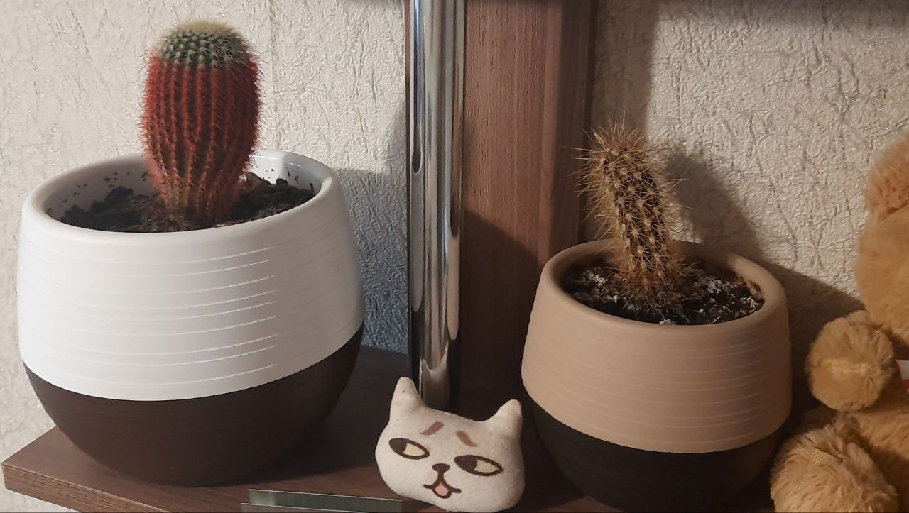 1. два кактуса, не знаю даже как их вид называется, через поиск по картинкам ничего не выдало толкового, один умер, другой вырос - наверное его красителем красным поливали, поэтому теперь шапочка белая. 2. каланхоэ, парень подарил, он вырос, летом ему наиболее хорошо было, сейчас ему очень плохо и я не знаю что с ним делать 3. купила в пятерочке, суккулент, был qr-код, но на всех горшках он не читался, просто по словам в гугле не смогла найти инструкции.