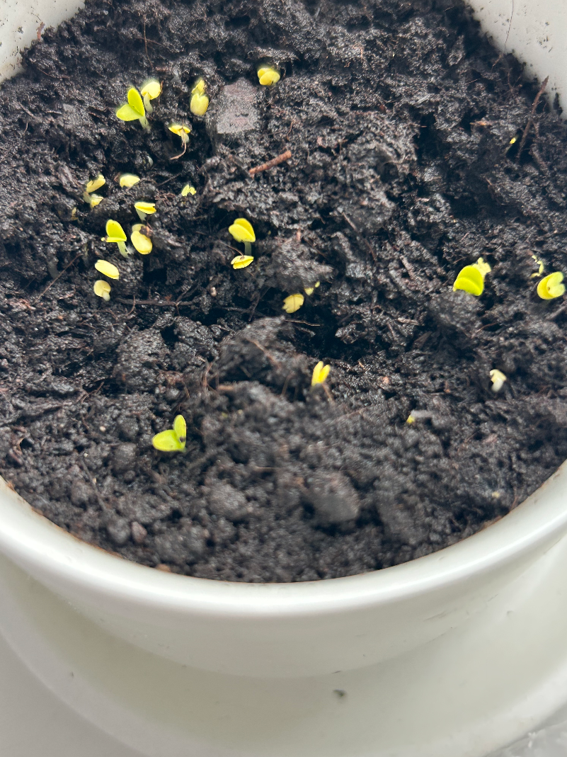 Зелень растет очень быстро, буквально за 4-5 дней их уже можно срывать. Вообще у меня набор за разной микрозелени и 6 горшков, но они так быстро растут, что все сразу и не нужны. На фото в желтом горшке называется "салатный микс", а в голубом побеги броколли.