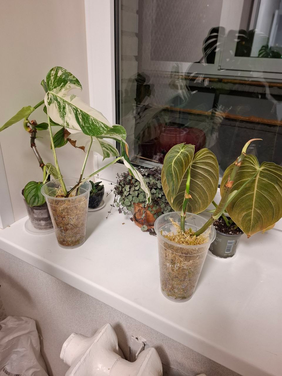 Ко мне приехала сансевиерия через сдек. На стакане написано Diamond Black, но на вид я их не различаю. Ищу горшочек и грунт, надо пересадить поскорее. Филодендрон дал еще один лист, любуюсь, стараюсь не проткнуть - очень уж они нежненькие. Ползет дальше, формирует следующий лист. Буду искать вытянутый ящик какой-то, а то скоро уползет и перевесит горшок. Пеперомия, стащенная с работы, уже дала первый корешок, ну какава молодчина! Стоит просто в банке с водой.