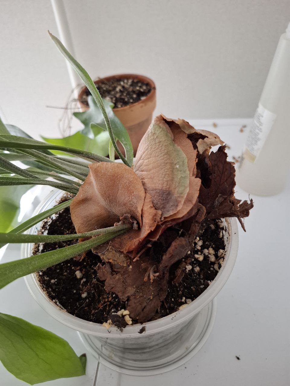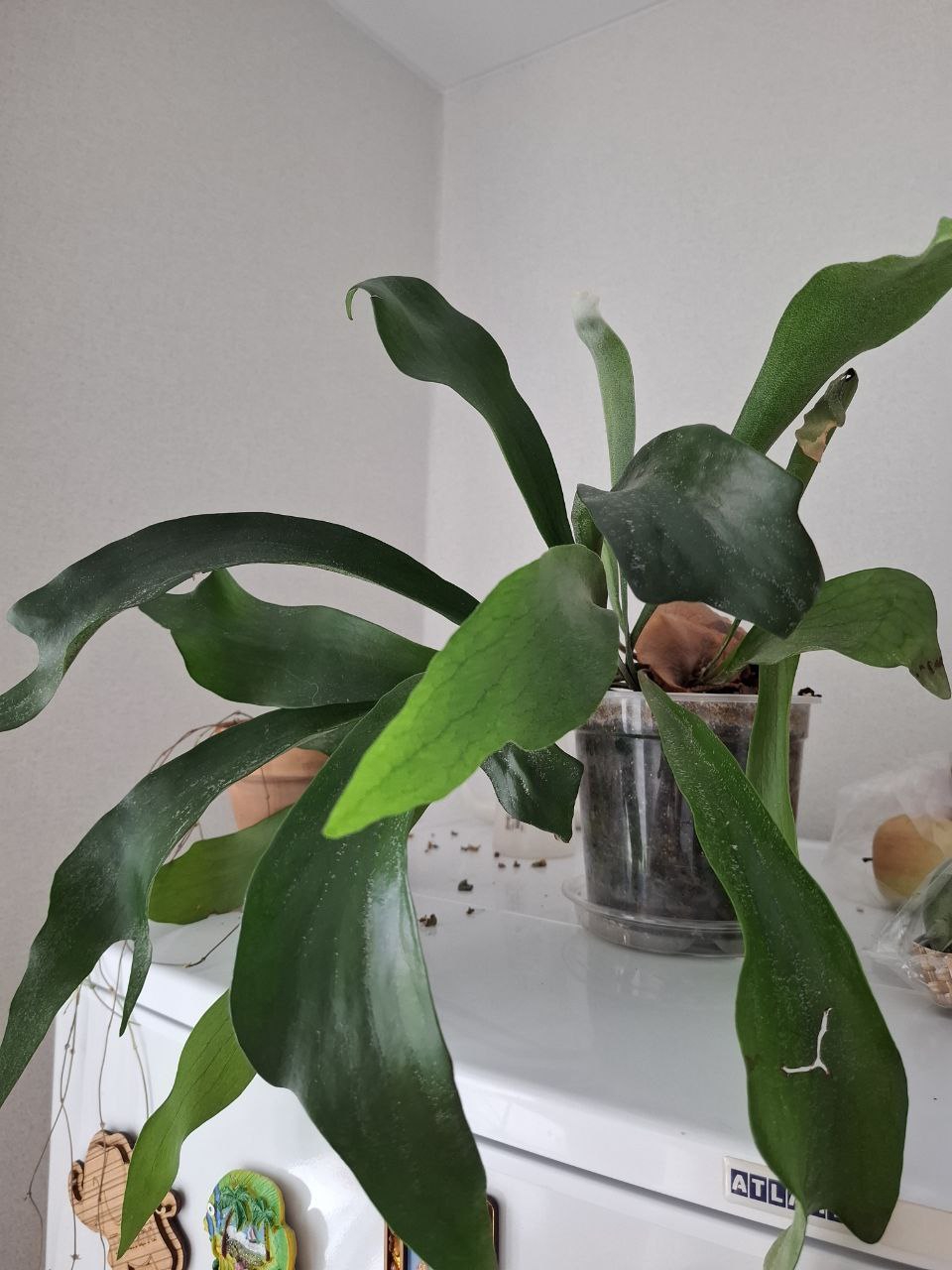 Платицериум пустил вот такую финтифлюшку, которая вырастет как вот эти коричневые рядом и засохнет в такую же коричневую. Надеюсь, ему у меня вообще ок, потому что для меня этот папоротник - самый непонятный зверь. Вроде ему хорошо, новые листочки пускает, но вроде и старые иногда вянут. Поставила ближе к свету, наблюдаемс