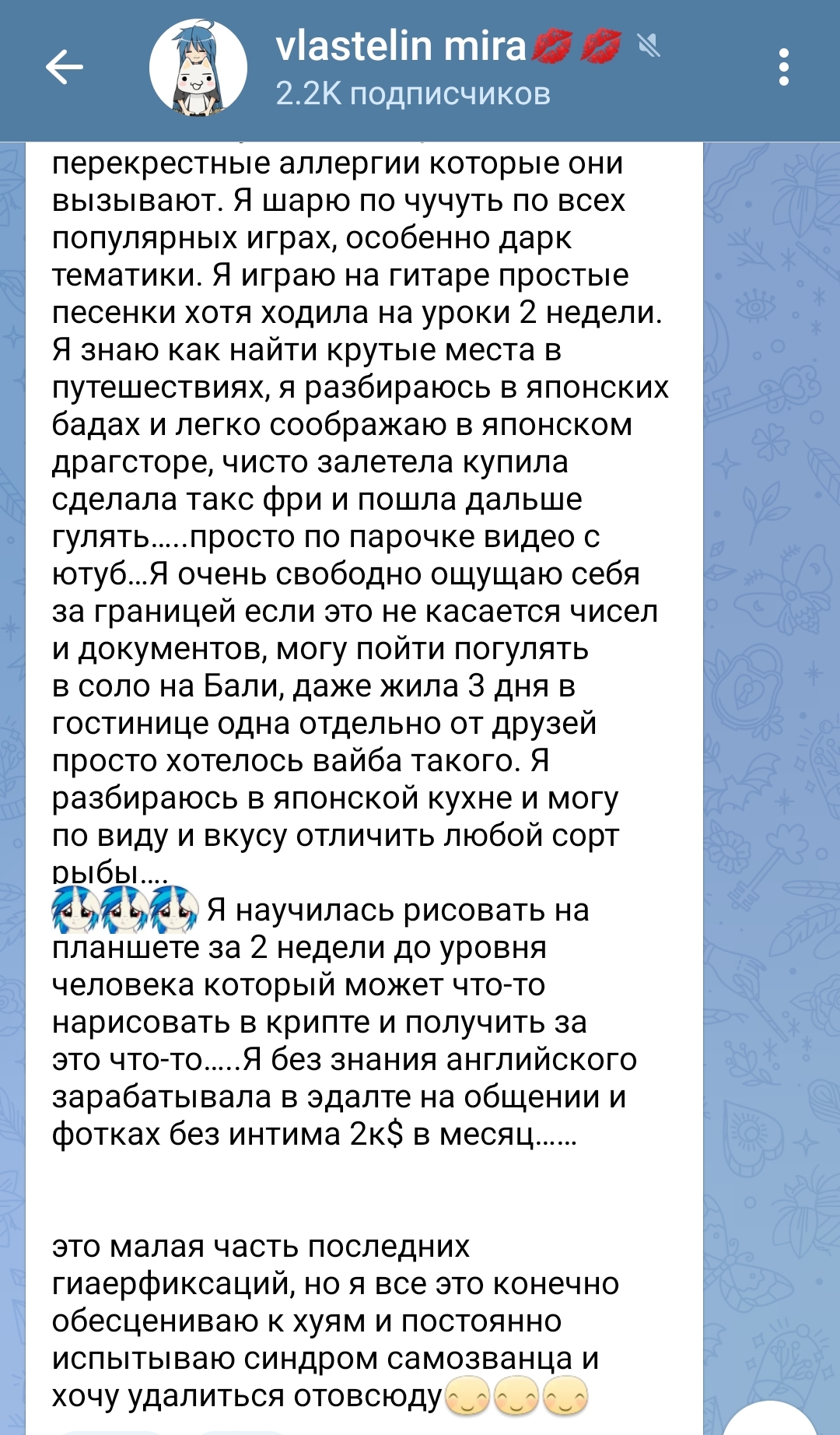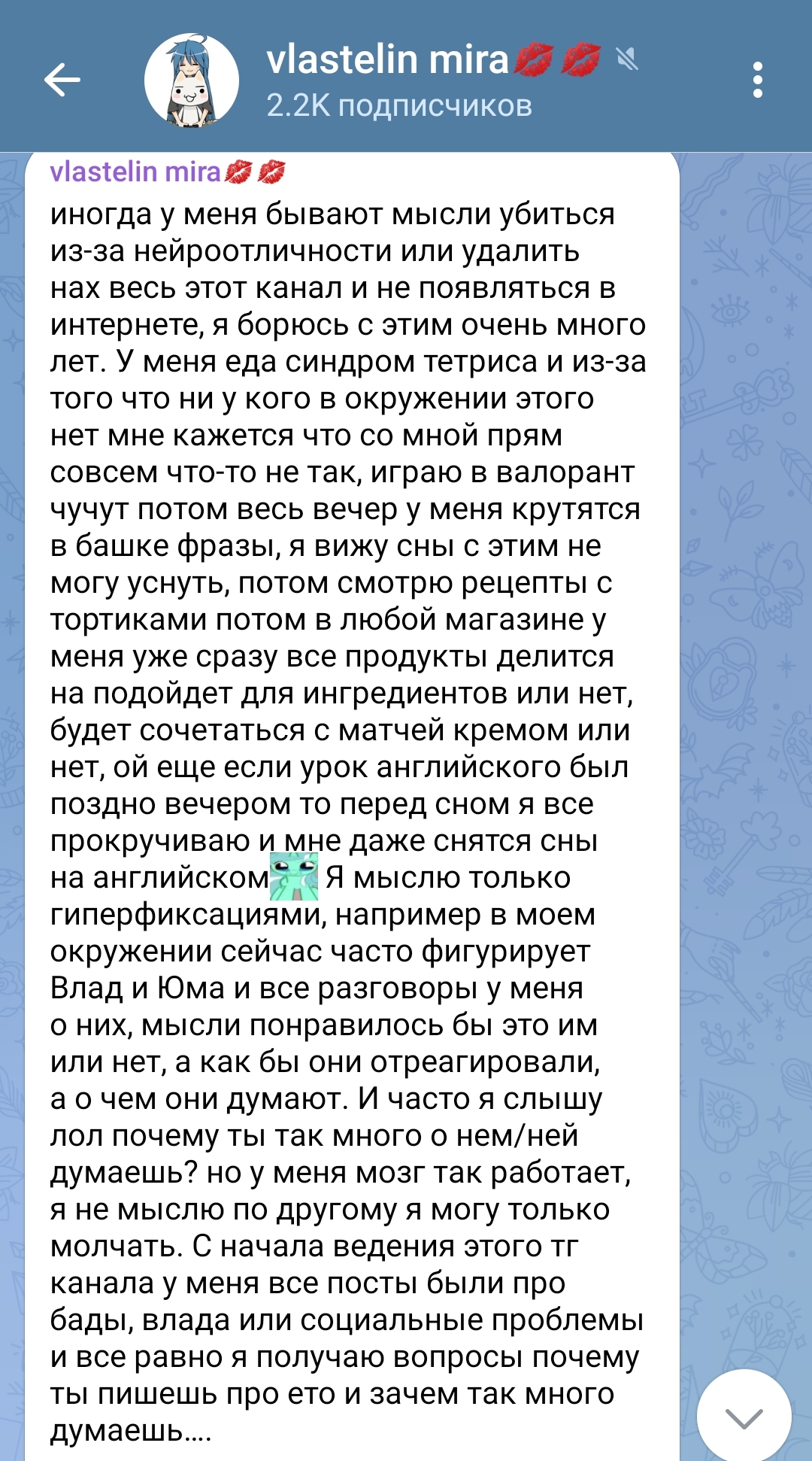>>6298379 Реальная агрошиза это та, которая кидается на местных и обзывает всех бабками, нищучками, всраткам То, что ты описала никому не мешает. Ты не личный адвокат блогеров, тебе не платят, забей и пролистни. Не про тебя пишут