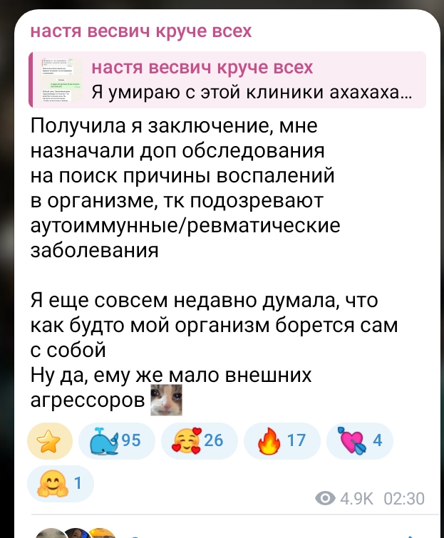 Причем я тебе прямо написала, что, к сожалению, ирл знала случаи, когда никто из близких не ожидал такого от человека, а он внезапно совершал ркн. Причем таких случаев было несколько.