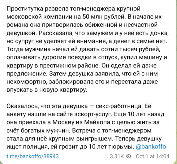 >>6298571 Нужны пруфы, что она ей занималась. Пруфы у нас в стране проходят через контрольную закупку и там вроде что-то уровня административки, если ты не организатор притона. Но с бабками за подарки это никак не связано.