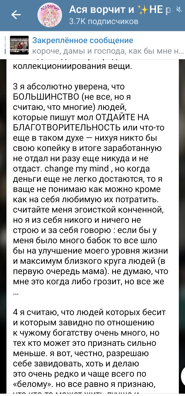 >>6298567 Ну вообще она в чем-то права. Мне интересно, что как будто сейчас завидовать стало не стыдно что ли. Люди публично с реальных страниц на говно исходят от злости к тем, у кого больше денег. Это смешно, но странно, что это не скрывают.