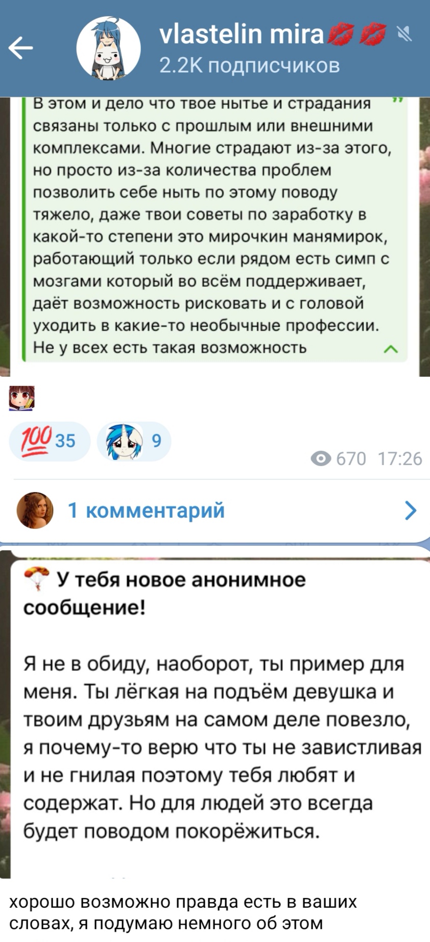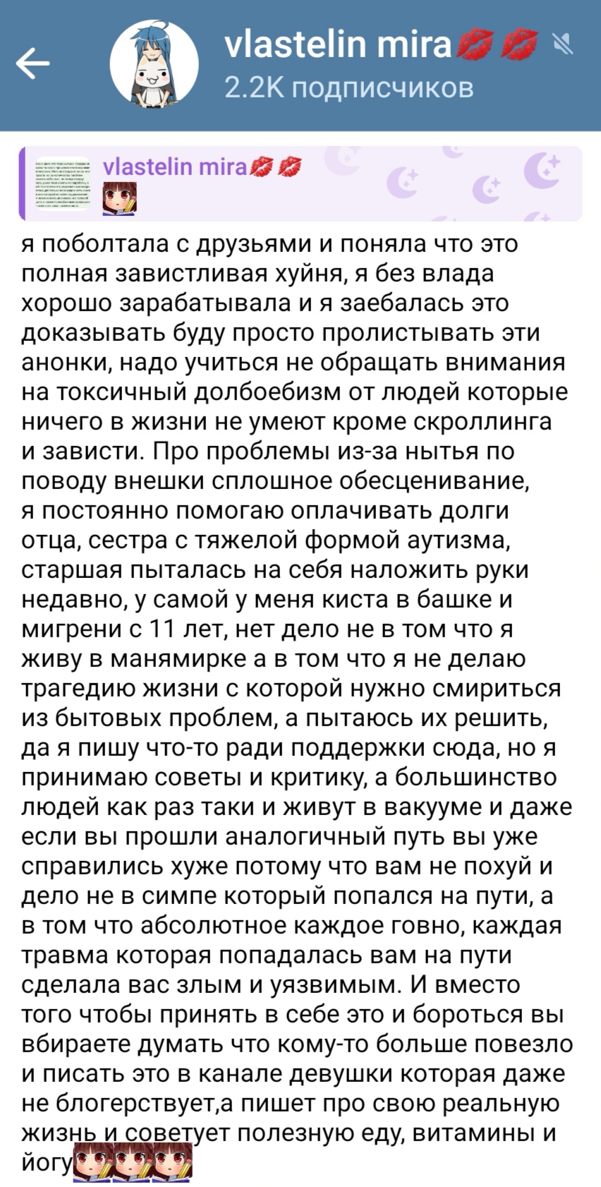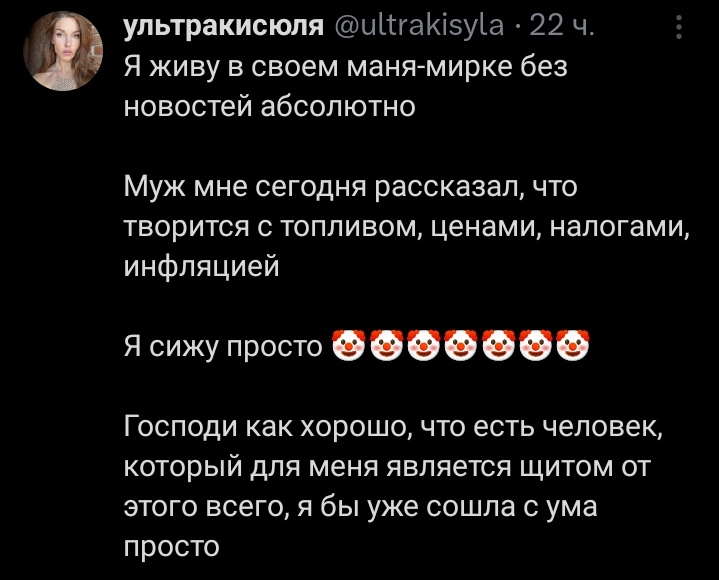 Меня достало морализаторство, будто у адекватных сис нет планов. Есть. И на чёрные дни есть, что продать из недвижимости, золотых украшений семейных и прочее. Это морализаторство непонятно потому, что мы не живём в племенной общине, какое дело до тех, кто живут с родителями, я даже не пересекаюсь ни с кем в жизни, в тредах разве что даю знать, что есть такие сисы, как я, и сразу налетают с "а твои родители умрут, а работать будешь на кассе". Все смертны, касса мимо, удаленная работа лучшее, что есть. Но нет. Не успокоятся и будут морализаторствовать.