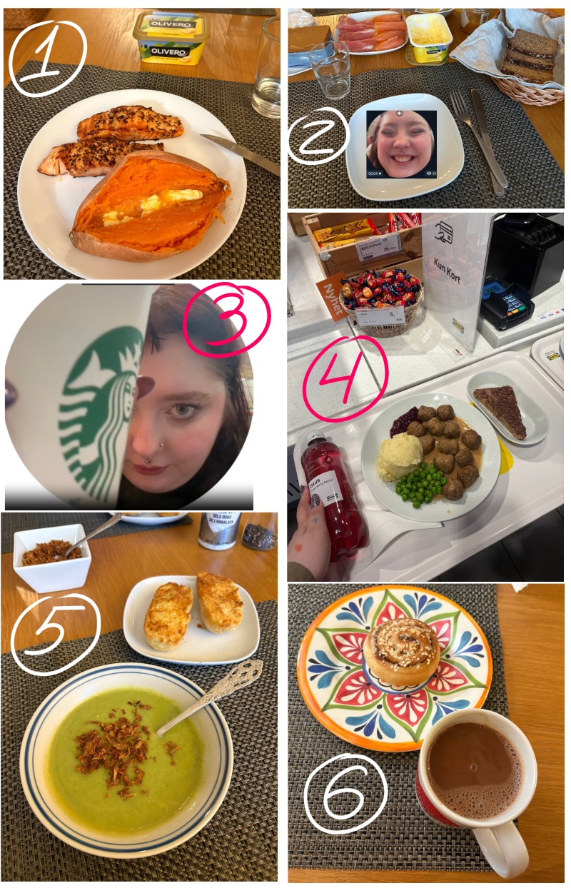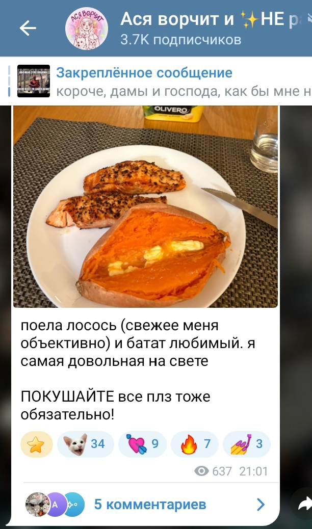 Мне было абсолютно нехуй делать и я решила собрать весь рацион Бубы за 1 день, вернее то, что она показала в тг, имхо там может быть и за кадром сверху что-то съедено 1) Лосось и батат с каким-то там соленым маслом 2) Лосось (уже не запеченный), бутеры с соленым маслом и карамельный сыр какой-то 3) Самый большой объем тыквенного латте из старбакса 4) Икеевские фрикадельки с пюре, горохом + сахарное пойло + пирог сладкий 5_ Суп пюре с жареным луком и гренки с сыром 6) Булка и какао