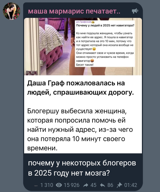 >>6302018 А в чём доёб? Два чаю графихе. Я всегда подскажу дорогу бабушкам старым и иностранцам, которые вообще не ориентируются. Но тратить время и что-то гуглить молодым людям или людям среднего возраста, у которых под рукой смартфон, это пиздец, согласна. Сами в телефоне три в ряд гоняют или тикток скроллят, а яндекс карты открыть не додумаются.