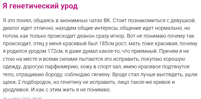 >>6302715 Я очень их боюсь с детства, не знаю почему, не могу с ними заговорить. Так же не могу звонить всяким администраторам и бронировать ресторан без жесткой тревоги после. Спокойно говорю со всеми людьми кроме людей из сферы обслуживания. К баристам кстати не относится, только к офикам и админам. Я вообще хз в чем причина. Специально ходила одна, заказывала сама все, сама бронила, звонила, так сказать встречалась со страхом лицом к лицу, но нихуя не помогало, точно такая же реакция почти на все разы Могу подойти познакомиться с парнем на улице без тревоги, но именно ЭТО сделать не могу. Точнее могу, но ладошки вспотеют и сердце будет колотиться