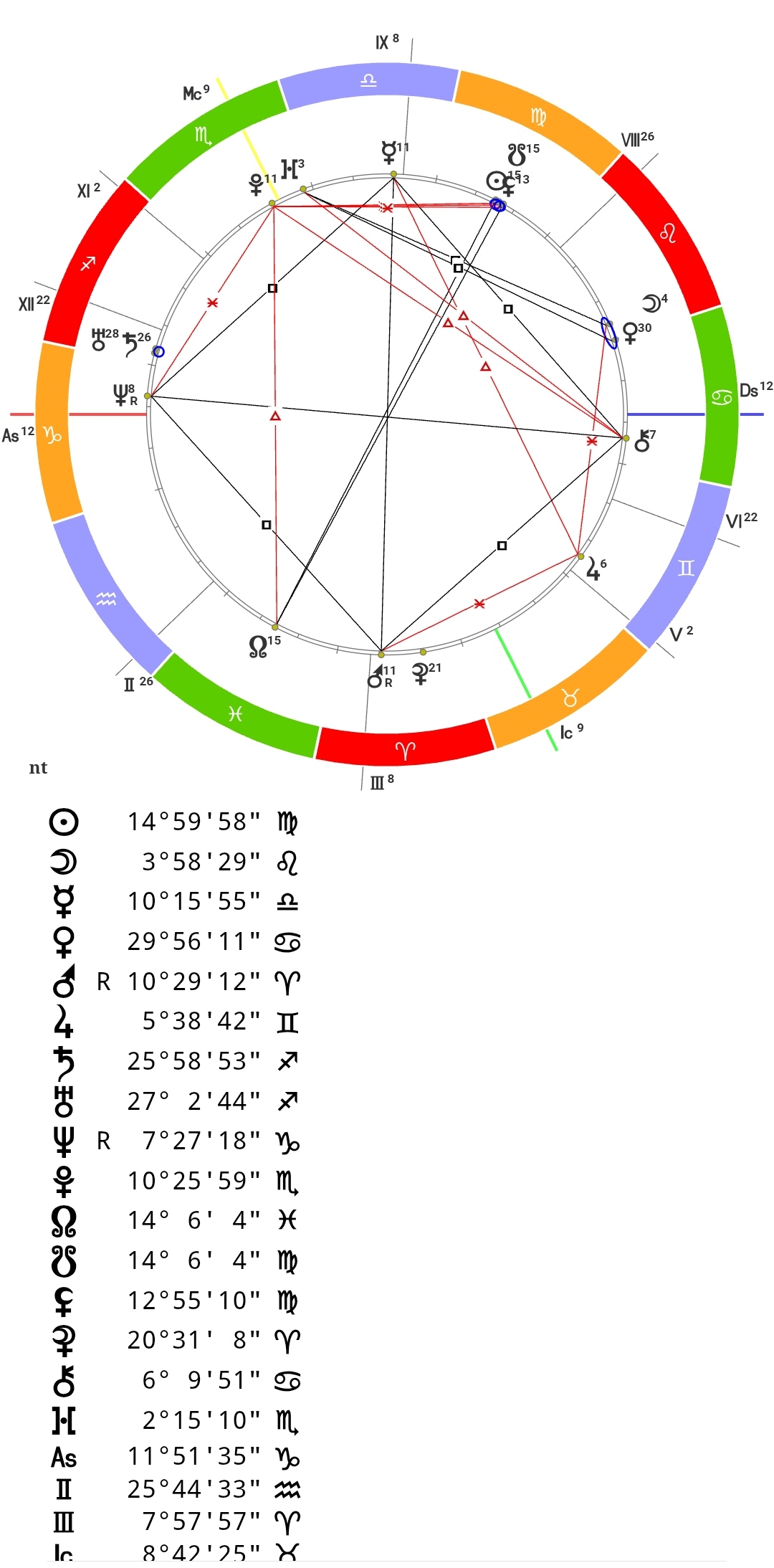 >>6329163 Я тут вижу основную проблему что Меркурий как диспозитор Солнца в оппозиции к Марсу из 3 дома и в квадрате с Хироном в 7 (типа тупые бабы из коллективов, хз, ещё и в Раке) и с Нептуном в Козероге (это тоже что-то тяжёлое, как и Марс в Овне). Берегите себя, осторожнее с людьми. Ещё квадрат Венеры и Луны с Прозерпиной вносит свою лепту. Луна во Льве тут в принципе какая-то одинокая, Венера в 7 в Раке опять же тупые бабы, которые могут Вас попрекать в чём-то, портить жизнь и такое. Меркурий в Весах в 9, Луна в 7 во Льве, Асц в Козероге - может, ощущаете или ведёте себя несколько аристократично, холодно и мб "свысока". Такое что-то, и это может провоцировать других людей на конфликты. На планеты в 12 я не смотрю, они во-первых не личные, во-вторых 12 дом вообще сложный и мутный для понимания. Ну, управитель 1го дома Сатурн в 12м + Нептун почти в 1 это может давать признаки Рыб во внешнем проявлении, опять же та же холодность, мутность, мб сказочность некоторую. Солнце в 8 да, сложное, и оно с Лилит на Кету. Типа мол опираться на херовый опыт предков, прокладывать будущее к чему-то своему (Раху во 2м ещё и трин от Плутона). Плутон поддерживает вообще, будучи в 10 и Скорпе.