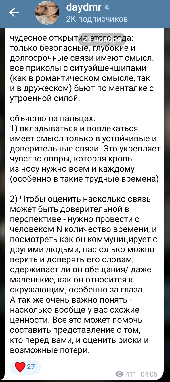 >>6347362 Я когда на терапии у психотерапевта была, очень хотелось со всеми поделиться, прям распирало, но не сразу такое пришло. Видимо, когда начала рассказывать врачу, уже было не остановить желание выговориться. Но это такое, проходящее желание, сейчас я могу просто как пример приводить из свое жизни в разговоре, да и то не всегда.