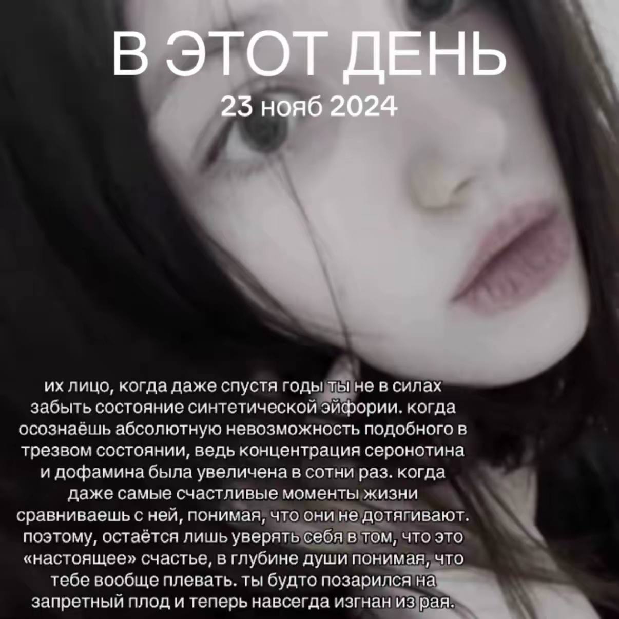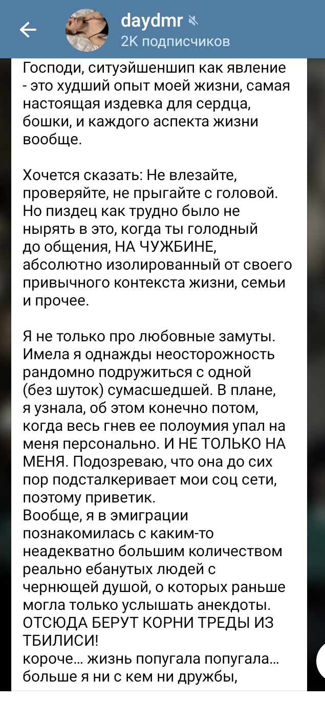 >>6347365 У меня соседка по кв была (24 лвл). Ее мать зарезала отца и отчалила, когда та младенцем была. Воспитала ее семья тетки. Когда мать откинулась то не вернулась к дочери и не общались. Когда со мной жила работала в банке и уехала отдыхать в Италию взяв больничный, из-за этого ее уволили (проверка банка), потом и парень ее бросил (ну у нее тяжелый характер). По инсте такая беспечная азер-стейси без проблем)