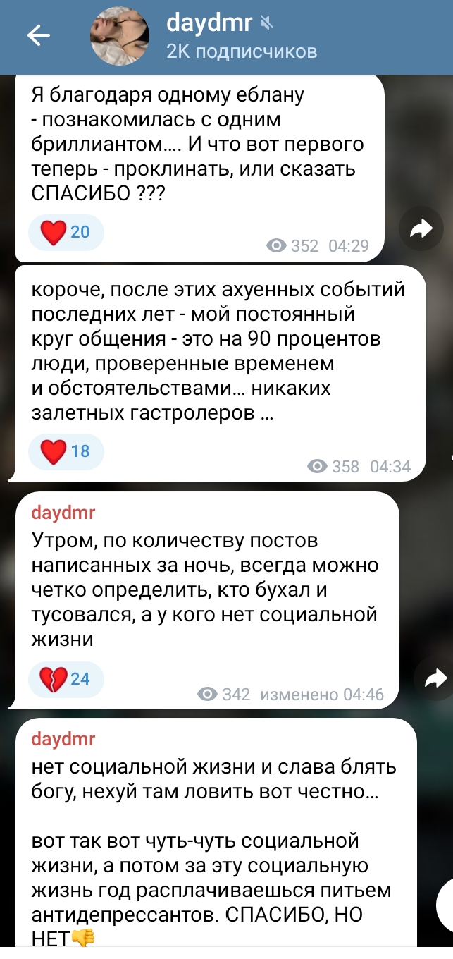>>6346377 Где она обсирала, можно скрины? И по романизации тоже хуй знает, я вот зашла в ее телегу, ну чо там хорошего: ебется с дерьмом, дерьмо содержит и ещё родителям стабильно похуй на дочь, ещё и денех теперь нет особо, нытье периодическое о своей житухе. Самое настоящее пособие как НЕ надо.