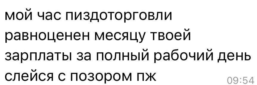 >>6346596 Пчел, ты собирай капитал и инвестируй во что-то, тогда будет цена твоим 200 бачам в час. Когда тебя юзают, а потом ты неделю восстанавливаешь менталку с помощью незаконных вещей, про которые снимаешь тиктоки, на развлекухи брата сливаешь деньги, то хоть 20, хоть 200 в час будет. У тебя доход нестабильный. Так можно вообще с голой сракой остаться. Если ты думаешь, что не доживаешь до 25, то тогда вопросов нет.