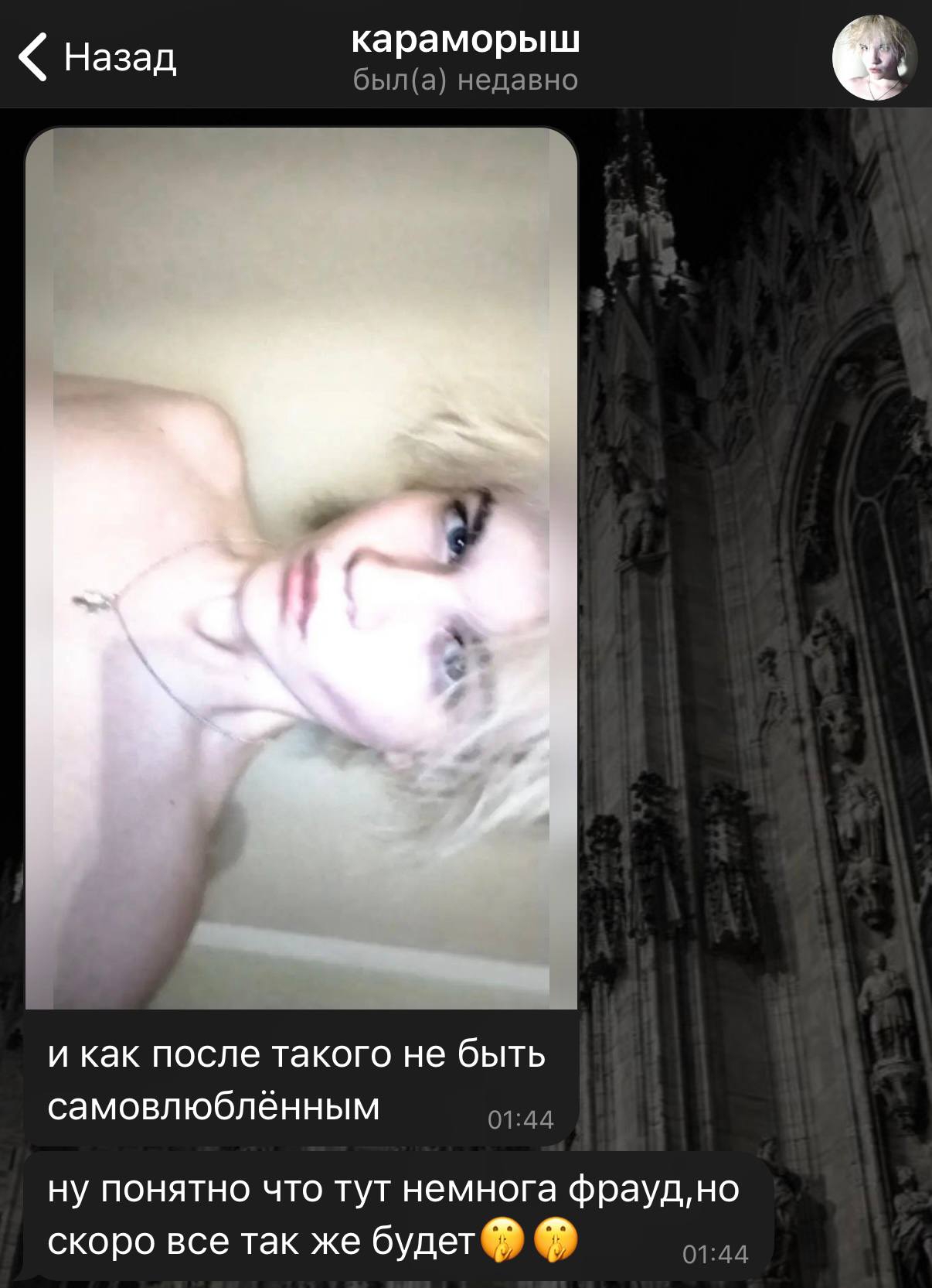 >>6346000 я думаю она ирл средне симпатичная, 6-7/10, вот нашла у неё в тгк фото с кукичем в зеркало лифта, будто бы фильтров нет, а боевой раскрас не сильно черты меняет, мб у неё без линз чуть меньше глаза чем на фото, но хз