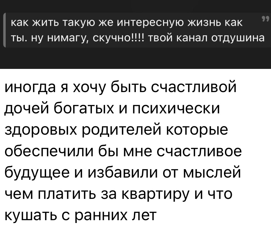 Как же Караморихе повезло, что родаки не муслимы, а православные, которые максимум вздохнут и головой покачают. Ее надо реально в строгую семью хотя бы на недельку, чтобы осознала, что такое гипер контроль и полное отсутствие выбора