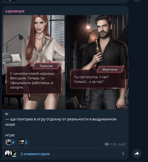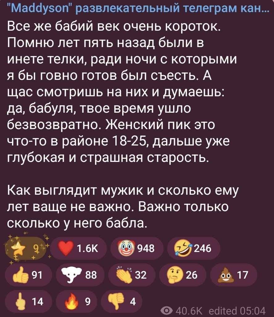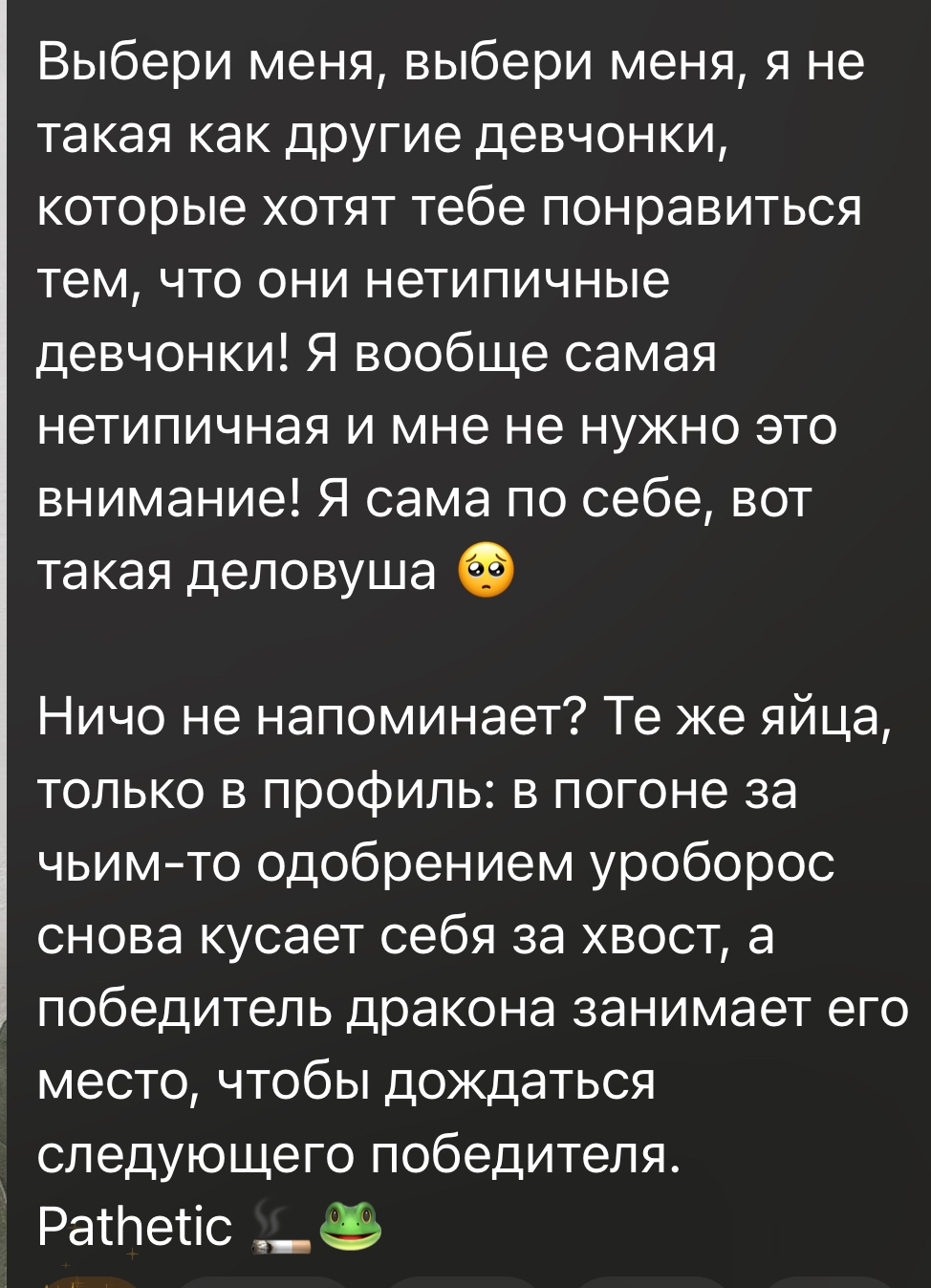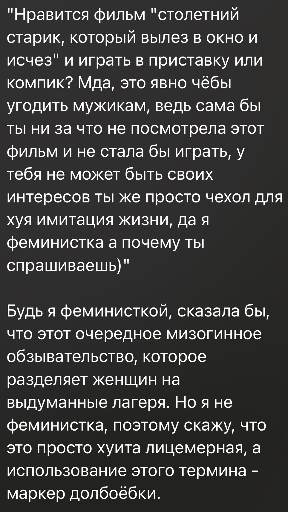 >>6344250 >прямо страшное преступление Не преступление, а повод. Все, что ты постишь – повод для обсуждения, смешков и троллинга, тут как бы даже феминизм ни причём. Это интернет, где тебя могут засрать за цвет глаз. И изображать карикатурную пикми в свои 30, ну это норм такой повод и байт. Другое дело, что она это наверняка неосознанно делает. >Я хз кем надо быть, чтобы так с этого оскорбиться и сразу додумать, что она до кого-то доёюывается. Я вообще не про это. Мой тейк был в том, что в комментариях у неё максимально безобидные зумерши, которые только и могут про пикми что-то сказать. И этой женщине ещё повезло, что ее ролик не залетел к мизогинкам-жопорихам, которые более матёрые в унижениях и обесцениваниях. Тоже тут разнылись, что тян пикмухой назвали, хотя это такая безобидная мелочь для интернета, что хз кем надо быть, чтобы с ЭТОГО триггернуться.