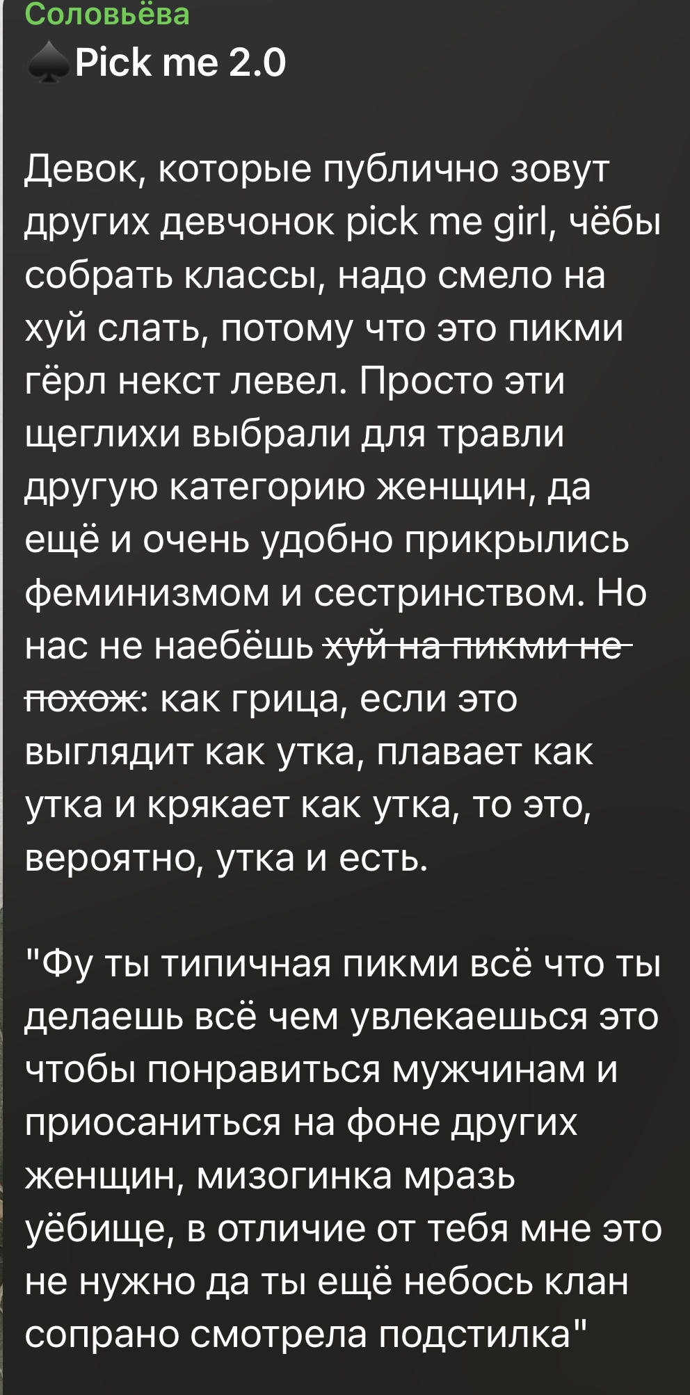 >>6344133 Напоминаю, что мы не в 2015 и Соловьева не актуальна уже лет 10. Спищданула она хуйню. Никто не называет пикми тянку, у которой просто пересекаются интересы с мужскими. Это именно набор качеств и "интересов", которые она имитирует чтобы влиться в компанию кунов и заполучить определенный статус.