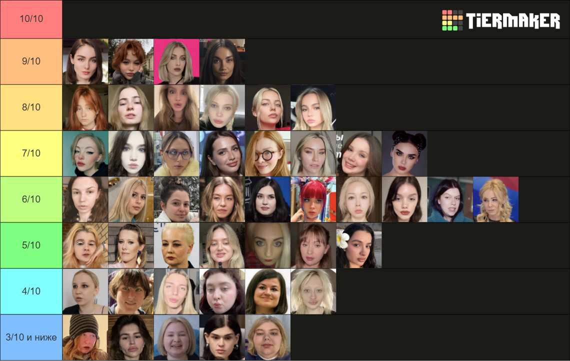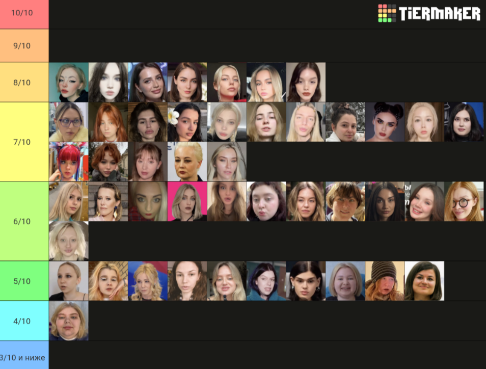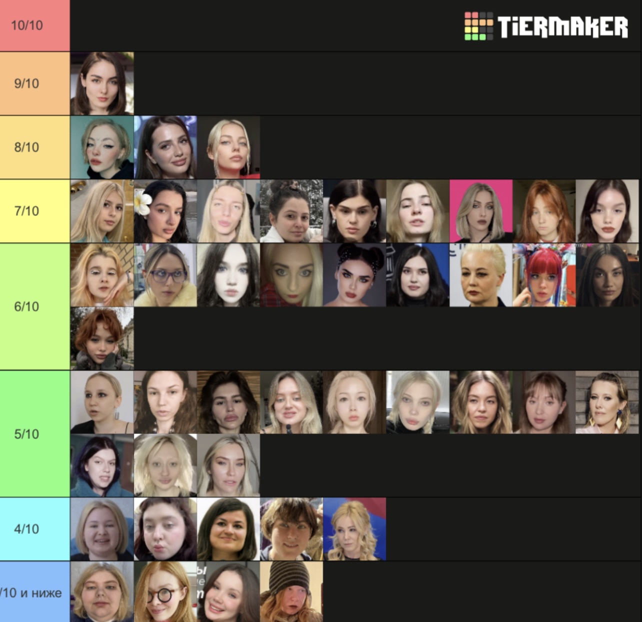 >>6345146 Попыталась расставить, потом поняла, что бессмысленно, потому что примеры фоток практически у всех неудачные. Кто-то в боевом раскрасе, кто-то в движении, кто-то без мейка вообще, кто-то в вырвиглазном мейке. Надо нормально фотки подобрать. По памяти и по тому как я их видела в разных ракурсах и стилях напишу текстом. В 10 Кищучку, Срэлю, Попошу, Кабаниху В 9 Пиписю, Дристомину, КаринЭ В 8 Урина, Эвелина, Карамориха, Букаха, Шапиха В 7 Царская, Клоп, Тендерли, Консерва, Блаженная, Анжелишечка, Альберта В 6 Сидни, Тигренок, Землеройка, Мармыха, Ракета В 5 Мирониха, Урбеч, Конасова, Мизулина, Новосад В 4 Светулик, Мадрид, Собчак, Пукалис, Оля Касс В 3 Саша Светова, Маргиналиха, Залина, Финесс, Монеточка В 2 Даша Друже, Свинус, ноунейм толстуха, Соня Грезе