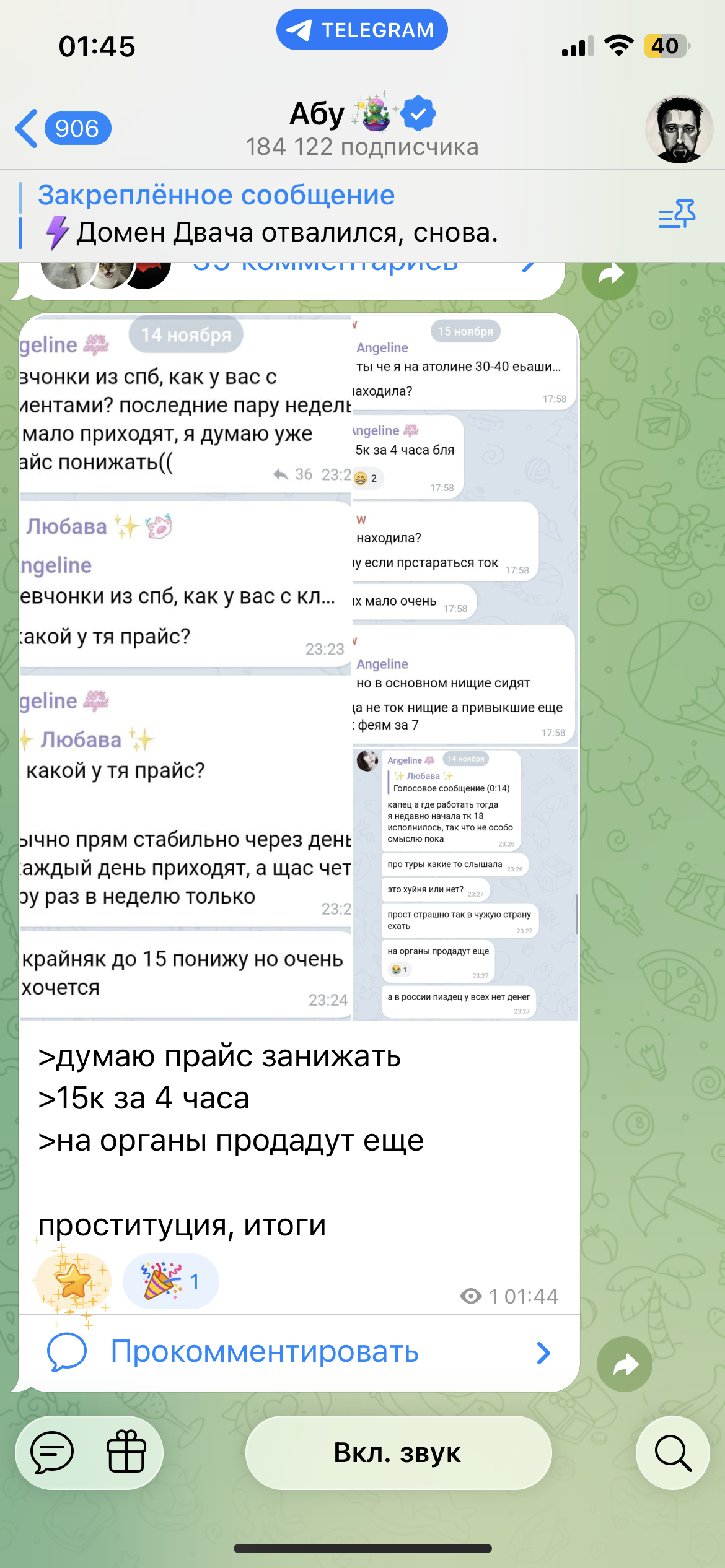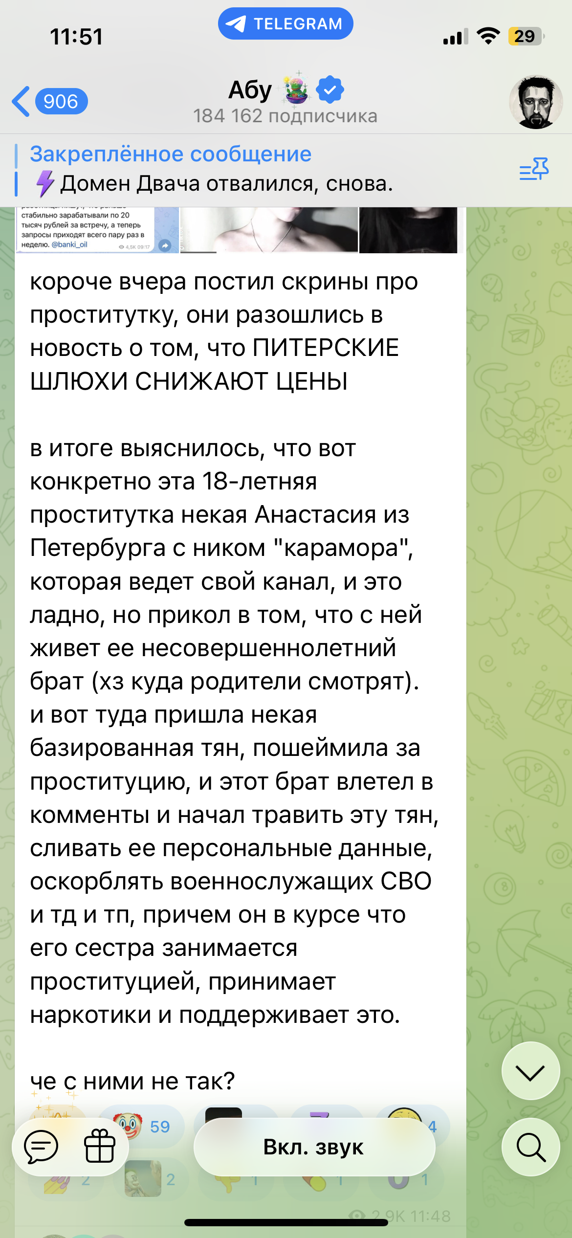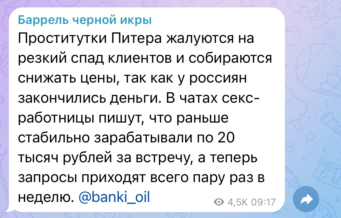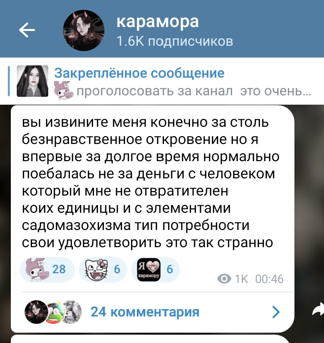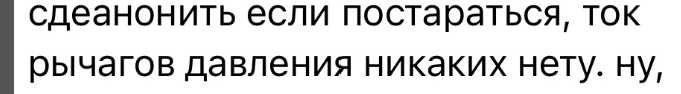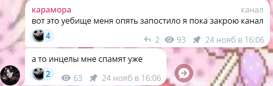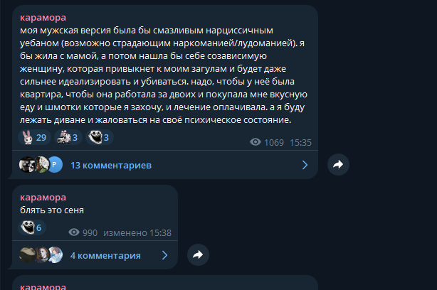 Очень смешно с потуг защитниц Караморы застебать Катюху обычными скринами ее постов в телеге. При этом на Катюху доставку действительно никаких рычагов давления от этого нет: ну оценят ее фоточки тут, ну посмеются/посочувствуют или поддержат. И все. Это Караморе и Сеньке мать пизды выпишет из-за накро-проститутского притона.