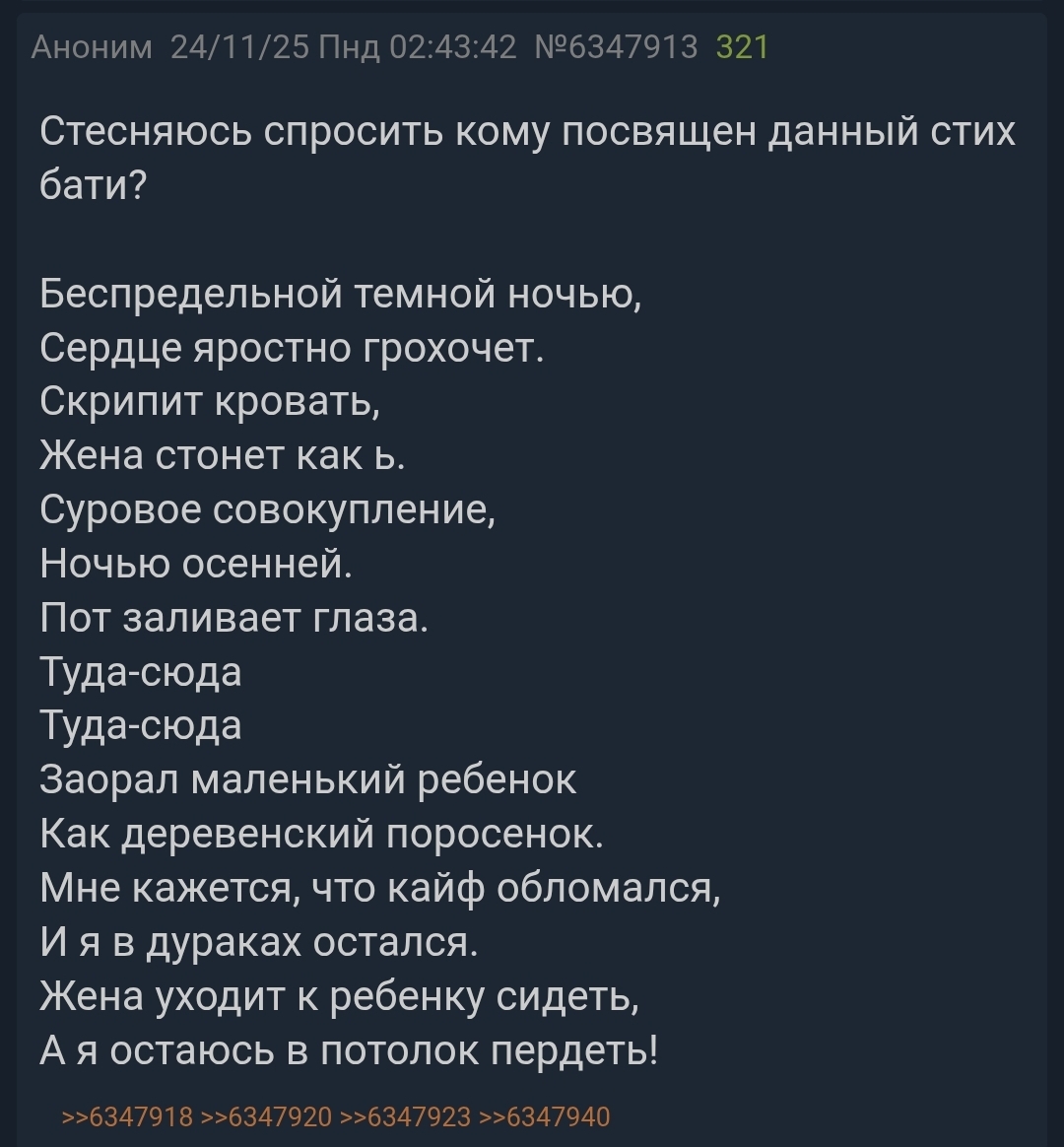>>6348405 Я уже писала ночью, что мой батя тоже был поэтом и всякую хуйню писал, но по сравнению с батей свинораморыша он просто гений поэзии, я не могу перестать визжать с этого бесконтрольного словоблудия.