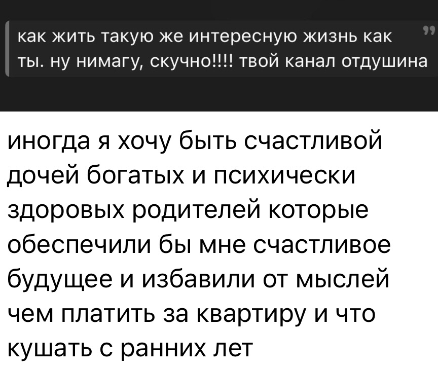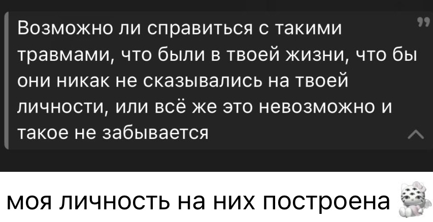 >>6349744 Да, тоже так думаю. У меня нормальная семья сейчас, кабанчики-пызнесмены и вообще нормально живём. Но при этом в 90-00-ых наоборот бедно жили, были родственники с псих.расстройствами и в употреблении. Сейчас они почти все умерли + маман пристроилась к богатому мужчине, и я вместе с ней получаю ништяки. Для мимознакомых всё круто и успешно, кто-то даже думает, что это мой родной отец и я из такой заряженной семьи всегда была. Гейропейские магнитики на холодильнике тоже в наличии, лол. Так и не скажешь, что пиздец какой-то был. Поэтому о настоящем положении вещей знает только Карамора. Судя по шизостихам бати и деду-веруну уже понятно, что не всё там нормально.
