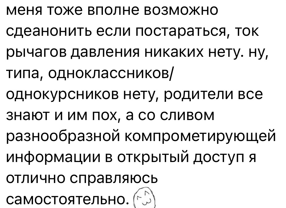 Сколько обсасывания темы, а к действиям перешла только Карамора. Только она сдеанонила Катю, а местные пупуни сидят и обсасывают, как они могут пожаловаться родителям и школе. А действия будут уже или так и будем обсуждать кто ЧИСТО В ТЕОРИИ мог бы пожаловаться на караморышей?