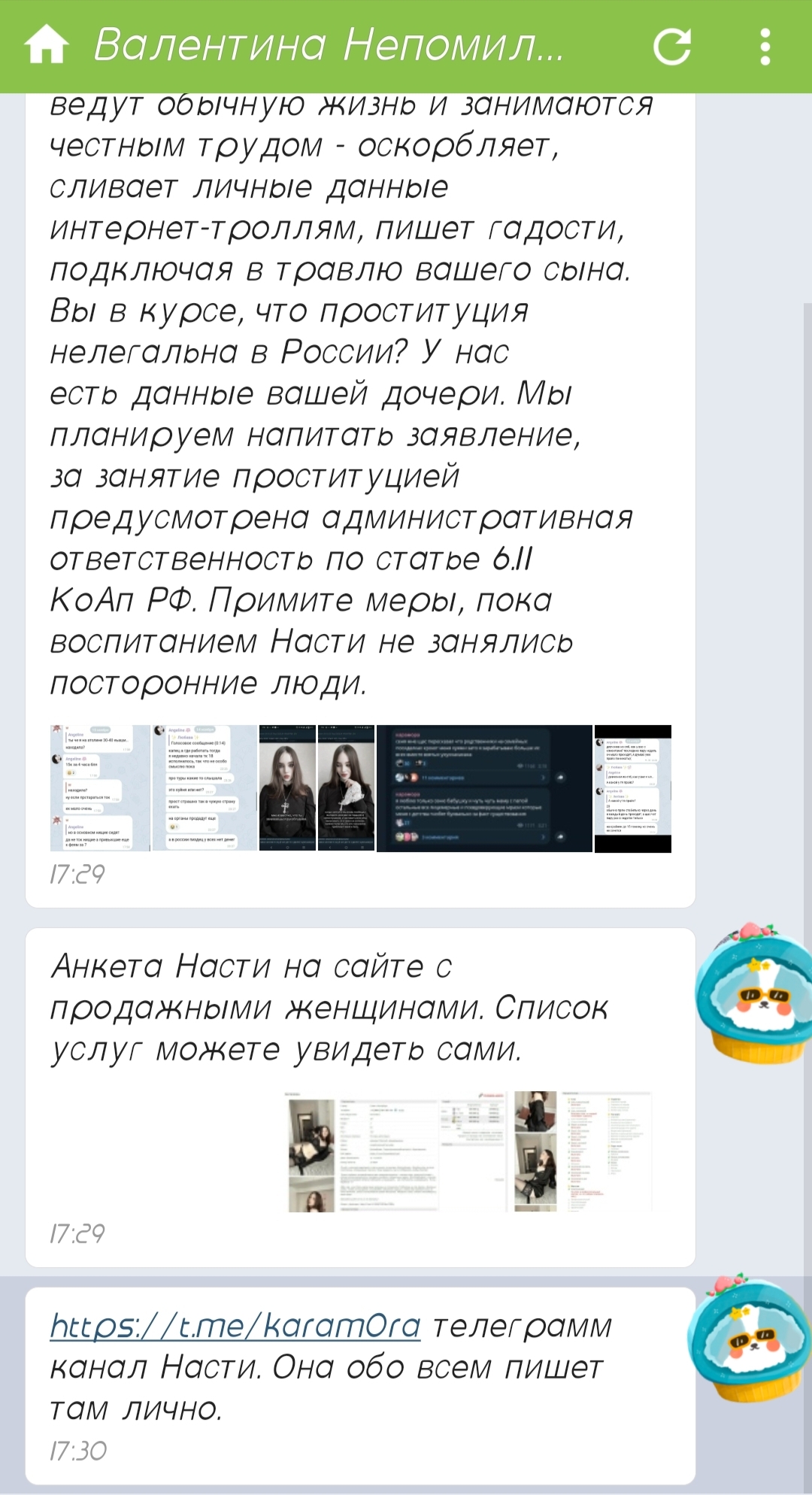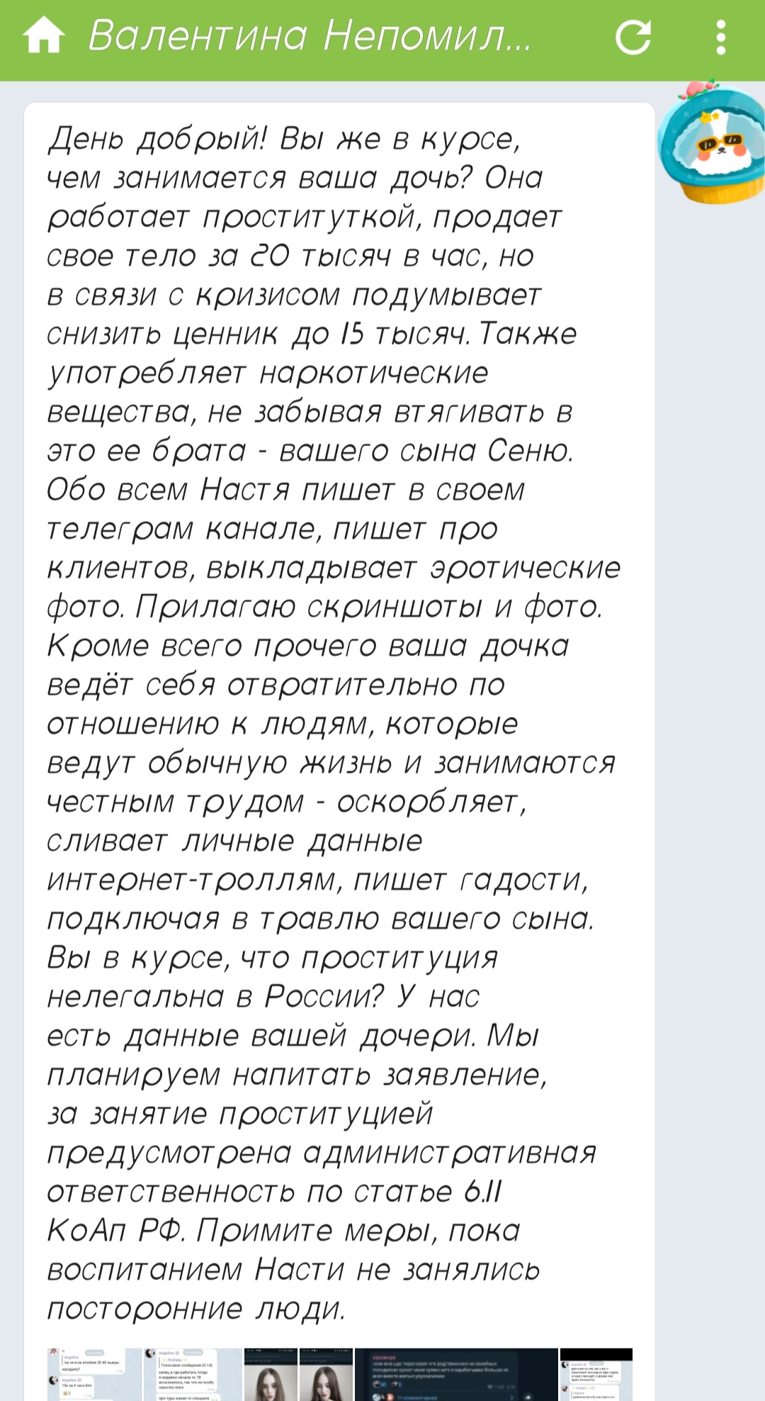 К нам в организацию неоднократно поступали жалобы граждан на противоправный и деструктивный контент, размещаемый в телеграм-канале «Карамора», который ведёт Непомилуева Анастасия Евгеньевна (ваша бывшая ученица). В данном канале открыто пропагандируется занятие проституцией, употребление наркотических веществ, размещаются материалы, унижающие человеческое достоинство, а также видео и тексты, оскорбляющие нравственные и семейные ценности.Особую тревогу вызывает тот факт, что активным комментатором и сторонником данного канала является несовершеннолетний Непомилуев Арсений Андреевич — ваш действующий ученик. Арсений комментирует публикации под своим настоящим именем и с реальной фотографией, используя при этом нецензурную брань, оскорбления в адрес женщин, угрозы физической расправы, а также позволяет себе крайне негативные и оскорбительные высказывания в адрес участников специальной военной операции и социально незащищённых слоёв населения (скриншоты прилагаются).Подобные действия подпадают под ряд статей КоАП РФ и могут быть квалифицированы по ст. 280.3 УК РФ («Публичные действия, направленные на дискредитацию Вооружённых Сил Российской Федерации»), а также по статьям, связанным с пропагандой запрещённых веществ и вовлечением несовершеннолетних в деструктивную деятельность.Учитывая, что Арсений — несовершеннолетний, мы пока воздерживаемся от передачи материалов в правоохранительные органы и Роскомнадзор с целью привлечения его к административной или уголовной ответственности. Данное письмо носит характер добросовестного предупреждения.Просим вас в кратчайшие сроки: провести проверку изложенных фактов; организовать профилактическую беседу с учеником и его законными представителями; при необходимости подключить школьного психолога и/или комиссию по делам несовершеннолетних.