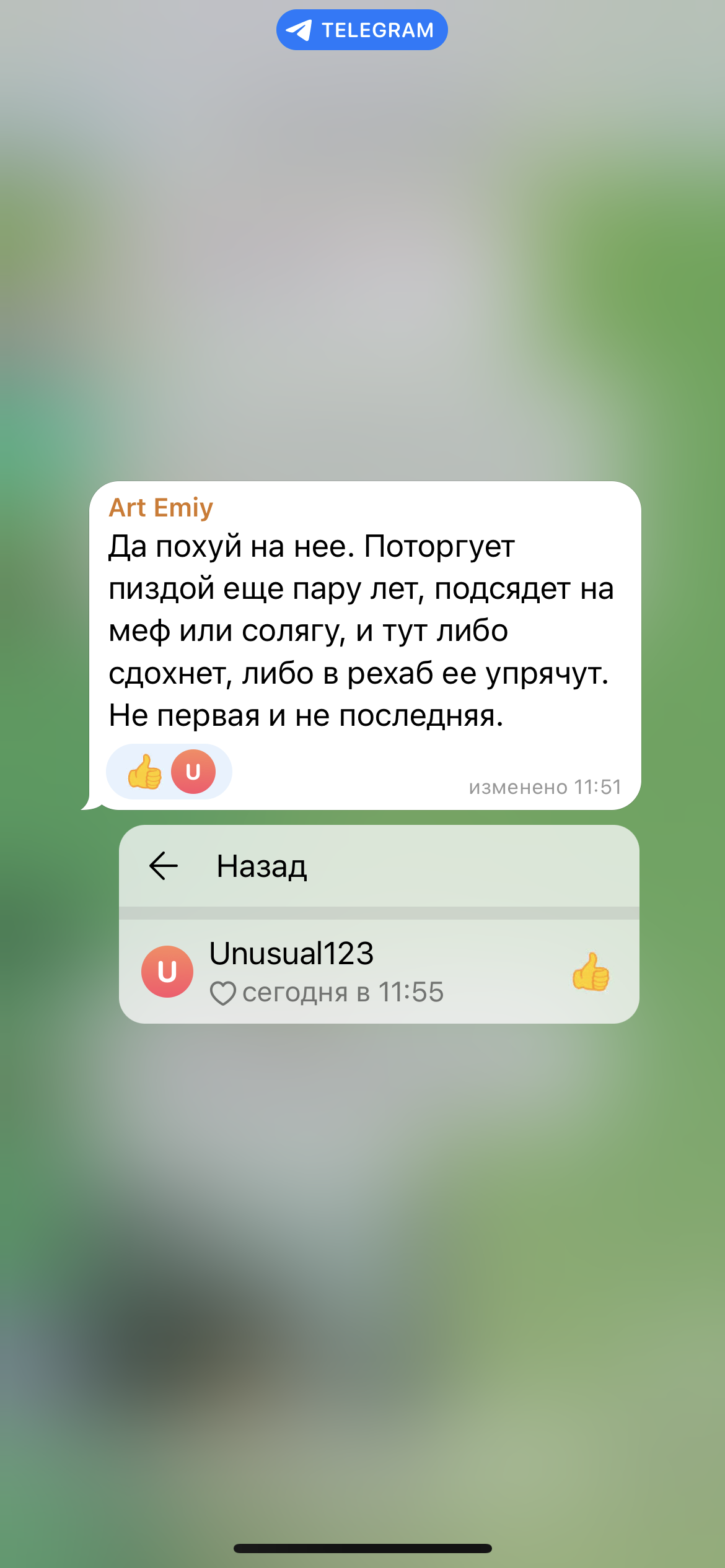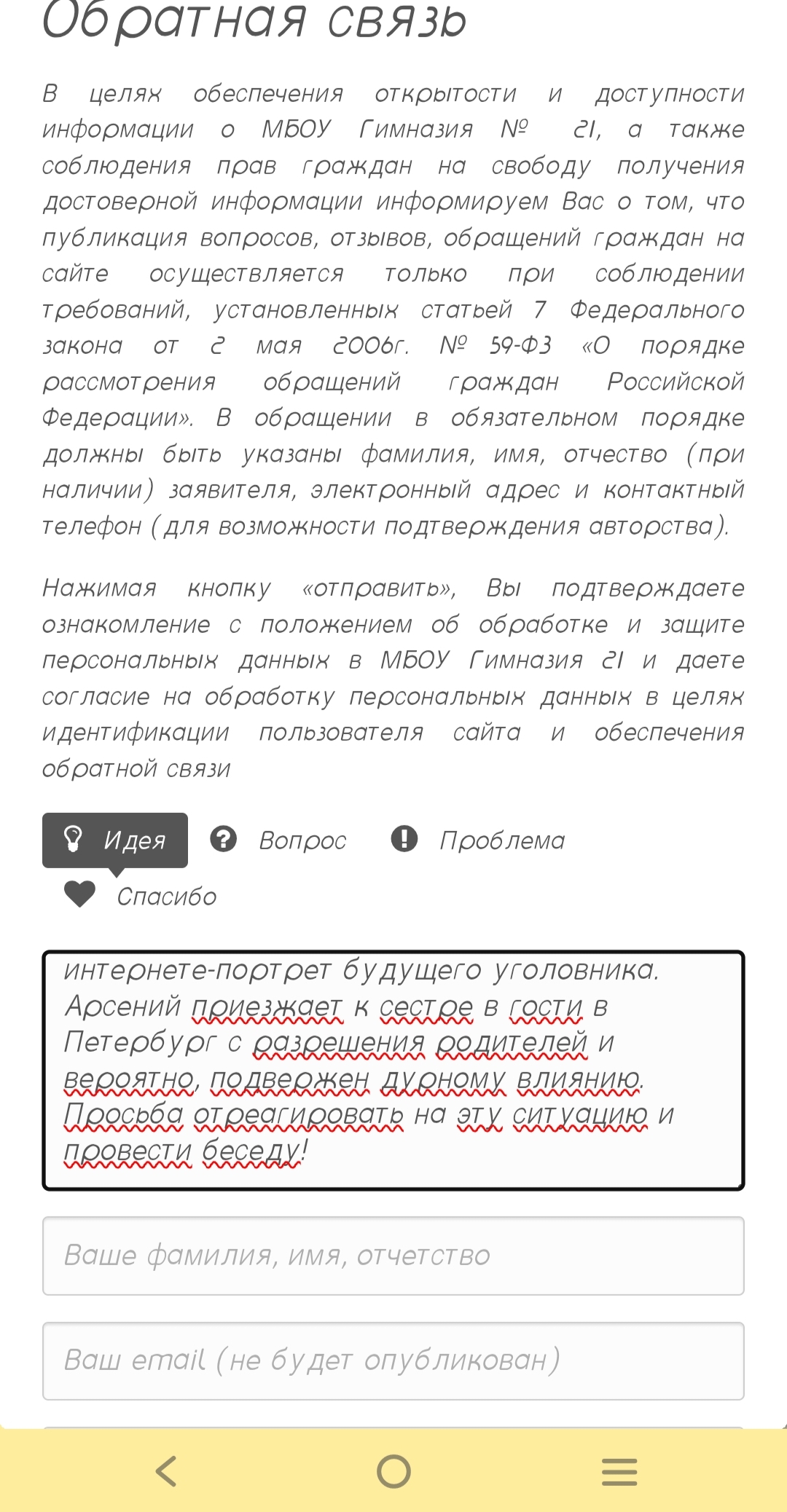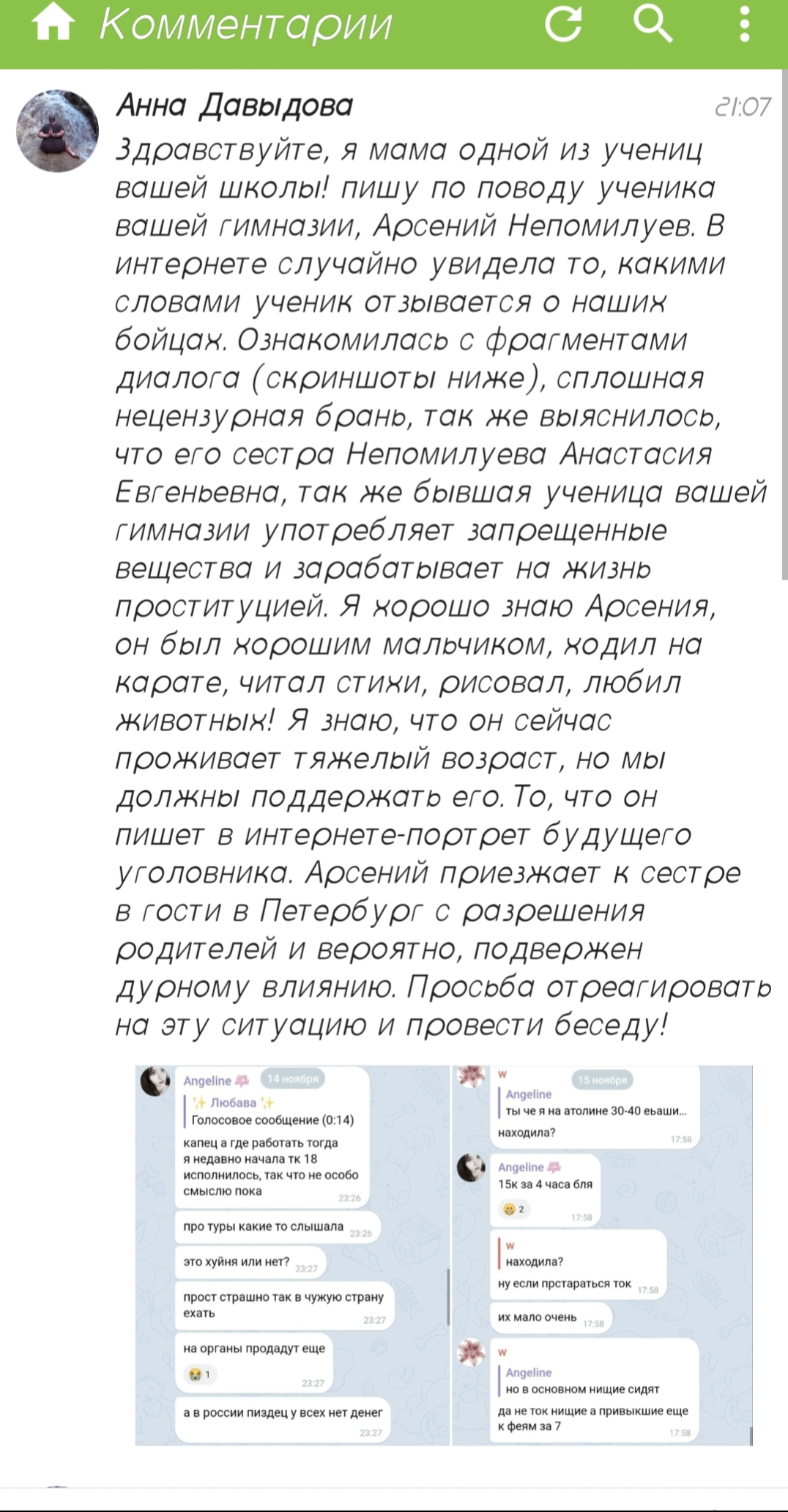 Здравствуйте! Пишу с огромной тревогой по поводу вашего ученика Арсения Непомилуева.Случайно наткнулась на телеграм-канал «Карамора», который ведёт его родная старшая сестра Анастасия Евгеньевна Непомилуева (кстати, тоже ваша бывшая ученица). В этом канале Анастасия открыто пропагандирует деструктивный образ жизни: признаётся в занятиях проституцией, употреблении запрещённых веществ, снимает видео, где целуется с мужчиной в платье, унижает малоимущих и хвастается заработком собственным телом.В комментариях под постами сестры Арсений (под своим настоящим именем и фотографией) активно поддерживает её, использует сплошную нецензурную брань, оскорбляет женщин самыми грязными словами, угрожает собеседникам, позволяет себе отвратительные высказывания в адрес наших бойцов СВО и малоимущих людей. Прилагаю скриншоты — всё легко проверяется.Я хорошо помню Арсения: он был замечательным мальчиком — ходил на карате, читал стихи на школьных вечерах, рисовал, очень любил животных. Таким мы все его знали и любили. Но то, что он сейчас пишет в интернете, — это уже не подростковый бунт. Это портрет будущего уголовника, человека с полностью разрушенной моралью.Родители, судя по всему, отпускают его в Петербург «в гости» к сестре и даже не подозревают, под чьим влиянием он находится. Арсений буквально впитывает этот образ жизни: ненависть, мат, угрозы, презрение к слабым, культ лёгких денег через унижение собственного достоинства.Мы очень боимся за наших детей — вдруг он принесёт эту агрессию и эти взгляды в школу? Репутация вашей гимназии всегда была безупречной, не позволяйте одному ученику и его токсичному окружению её запятнать. Если эта история выйдет за пределы чата родителей (а скриншоты уже гуляют), будет большой скандал.Очень прошу вас срочно отреагировать: вызвать Арсения и родителей на беседу, возможно, подключить психолога и комиссию по делам несовершеннолетних. Мальчик ещё можно спасти, но время уходит очень быстро.Заранее спасибо, что не оставите это без внимания. С уважением и надеждой, Екатерина из лиги безопасного интернета