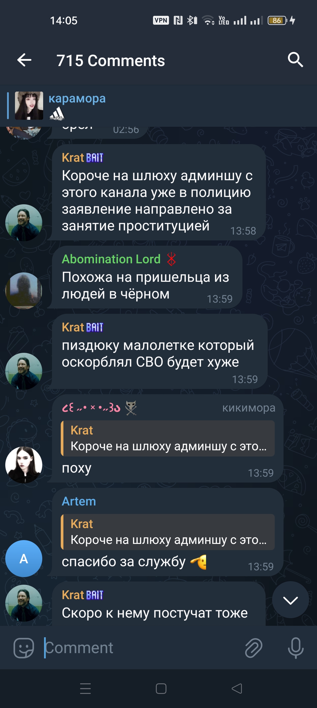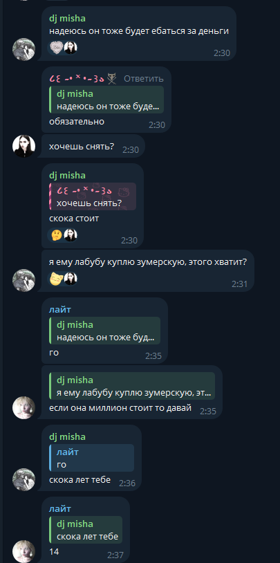 Здравствуйте, хотели бы донести информацию по по возмутительном проведении ученика вашей школы Арсении Непомилуеве. В интернете в телеграм канале "Карамора" он в комментариях высказывался в сторону женщин, малоимущих, использовал нецензурную лексику, угрожал своим собеседникам, критиковал ВСРФ, смеялся над СВО. (Прикладываю скрины). Телеграм канал ведёт его родная сестра Анастасия. Девушка пропагандирует деструктивный образ жизни, открыто признается в занятии проституцией, употреблении запрещенных веществ, унижает малоимущих граждан, хвастается своим заработком телом, снимает видео, как целуется с мужчиной в платье. Родители Арсения, видимо, не в курсе о то, чем он занимается в интернете и то, как на него влияет старшая сестра, с их (родителей) позволения Арсений ездил в Санкт-Петербург один. Пожалуйста, примите меры, мы боимся за наших детей. Еще несколько лет назад он был хорошим мальчиком, участвовал в школьной жизни, уважал старших, занимался спортом, а сейчас это портрет будущего правонарушителя. Очень наслышаны о хорошей репутации вашей школы, не дайте запятнать ее и примите дисциплинарные меры к Арсению