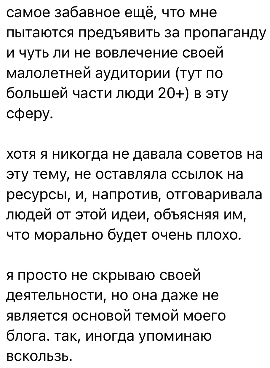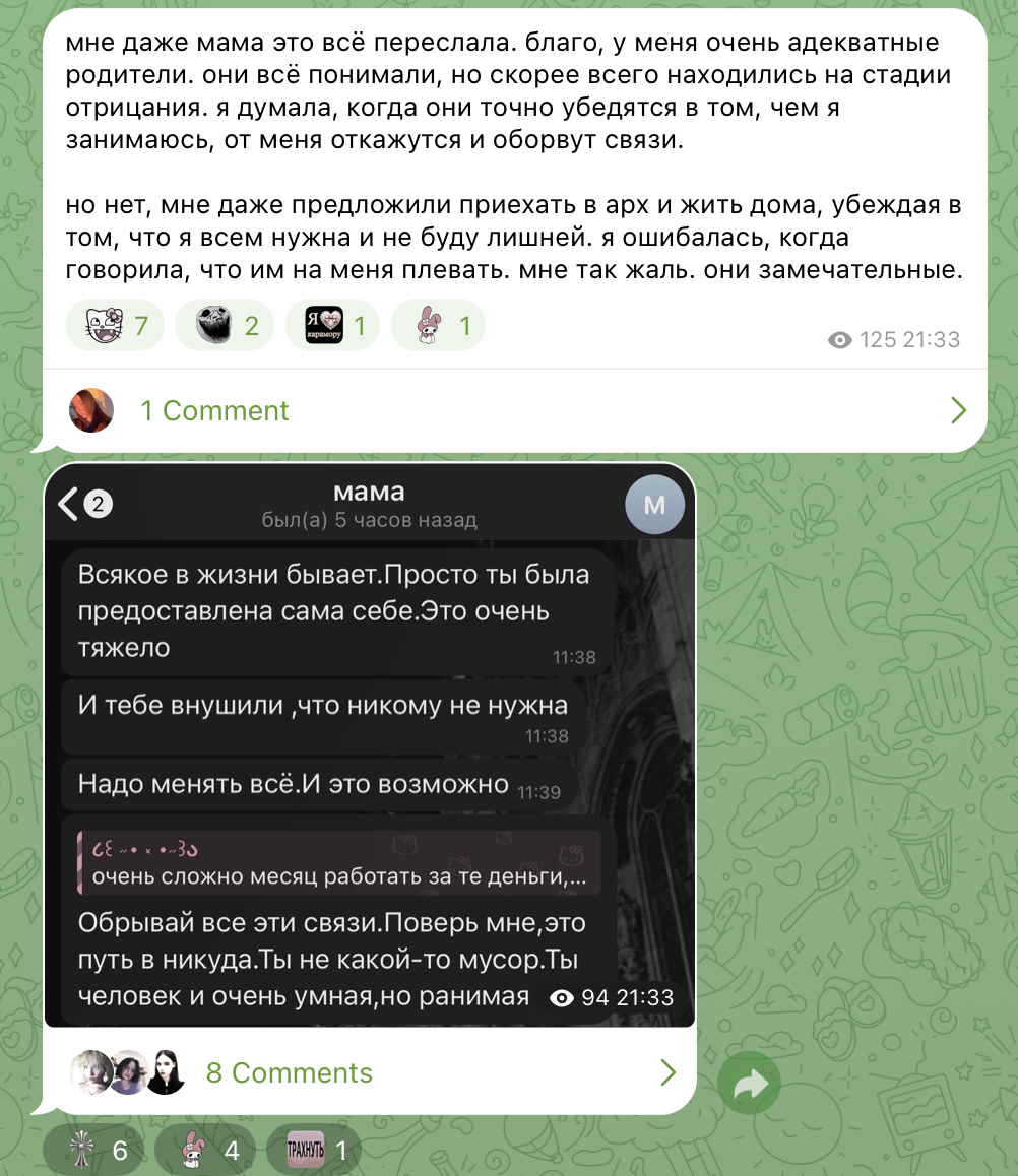 Из-за обсуждения вспомнила, как в 11 классе одноклассница (симпатичная альтушка) после совершеннолетия сразу же побежала в вебкам и бить татухи. Потом вроде бросила, но хз, не расспрашивала об этом. Это и тогда было стрёмно, но сейчас понимаю, какой же это пиздец.