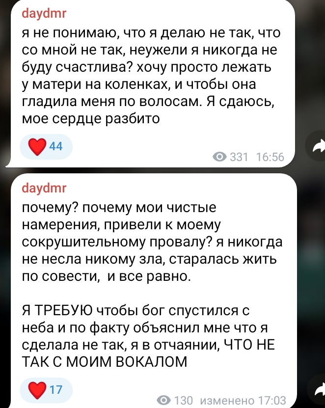 >>6351386 Не, караморыш вообще пуся была. Самое стрёмное, что мама ей сейчас (наверняка в слезах или тряске) пишет, чтобы прекращала, возвращалась и тд, а она буквально ряяя я так не смогу заработать на свои хотелки (то бишь меф, новый айофон, кутёж)!! Чисто более невезучая версия бубы, кмк.