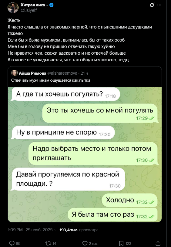 Так это именно жертва, потому что вне либфем тян просто не стала бы быть бесплатной проституткой. Я как та старуха из мема, чья жизнь прожита и слвва богу. Так вот, в то самое наше время было много говна. Но при этом были четкие критерии поведения правильной девушки и высокоранговой самки. Правильная девушка - занимается сексом только со своим парнем в отношениях, встречается с ним какое-то время и выходит за него замуж. Если ей предложить отсосать на первом свидании, это будет звучать как оскорбление. Взамуже никакого пополамства, ну обычно общий бюджет, в среднем все не очень богаты чтоб жить на одну зарплату, но все-таки основной добытчик - муж. Высокоранговая самка - архетип всяких Пэрис Хилтон и прочих звезд из нулевых. Она отличается чуть большей половой распущенностью и премиальной внешкой (стандарты правда ее сильно ниже в плане трайхарда), зато ей дарят брюлики и она может в 20 сидеть на содержании депутата. Но она тоже не бесплатная проститутка, а очень дорогая. В идеале ее вообще забрасывают подарками поклонники, а она думает кому давать из них и стоит ли.